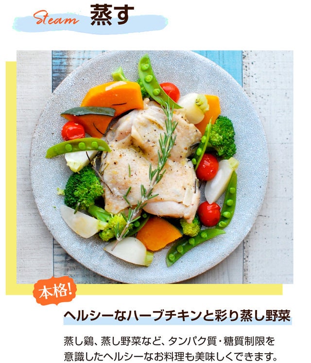 ❷蒸す・・・ハーブチキン、蒸し野菜、パエリア