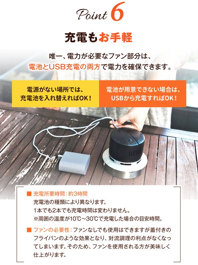 充電池を利用すればファン部分にケーブル差してUSB充電が可能なので経済的です。