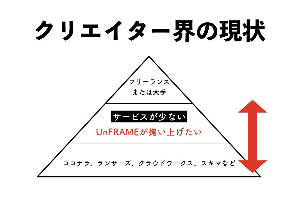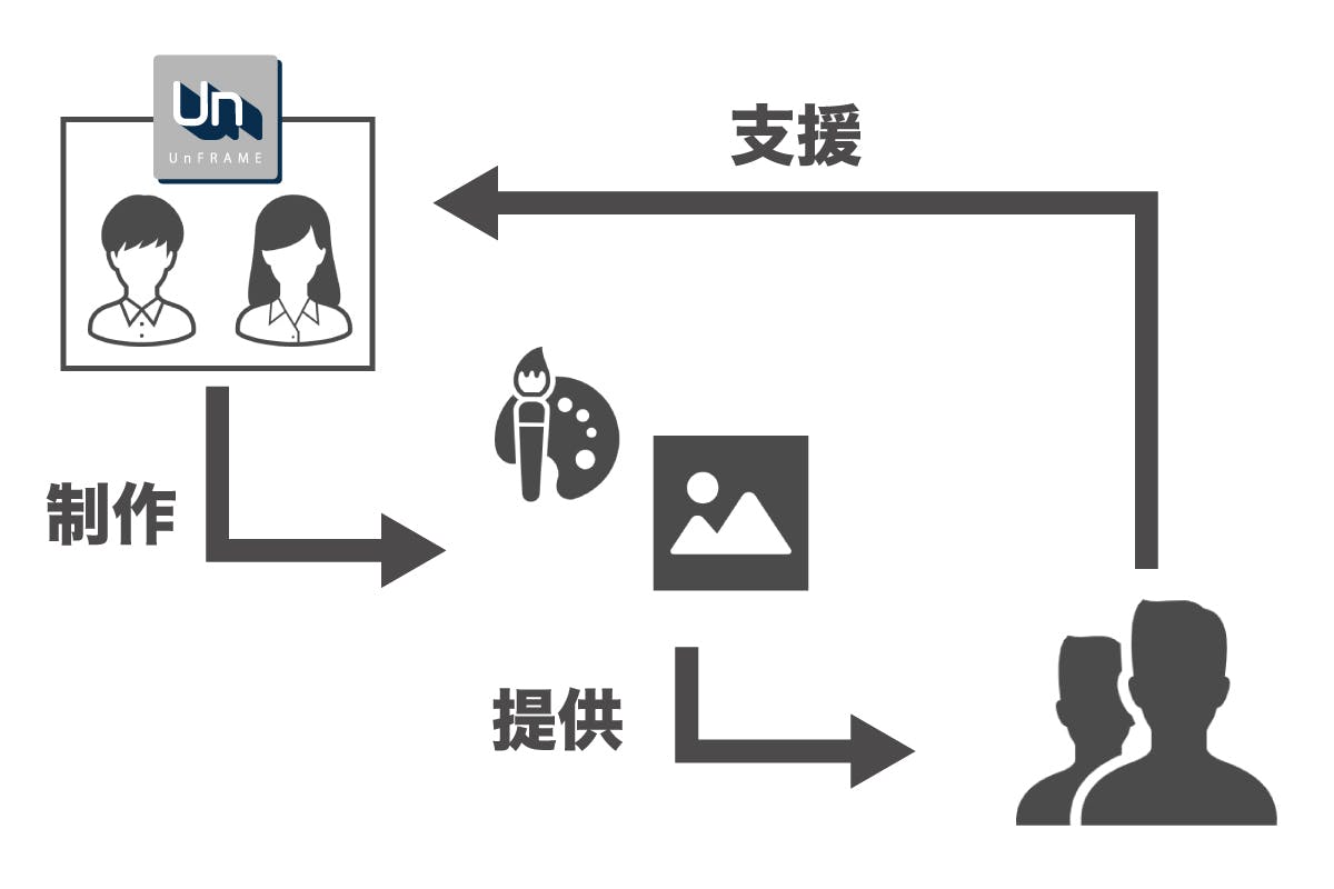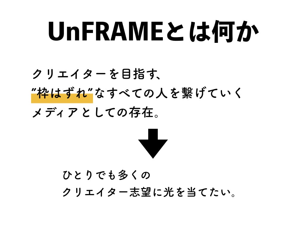 UnFRAMEは、「創作活動がもっと評価され、お金が払われる社会」「様々な課題を抱えるクリエイター志望が、夢を夢で終わらせルことがない社会」を目指しています。