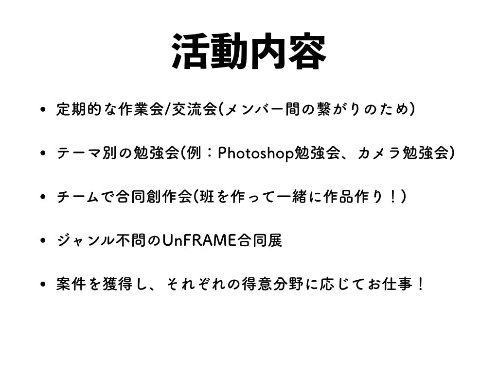 UnFRAMEでは、「横の繋がりを作ること」「お互いの知識を共有し学び合うこと」「皆で仕事を勝ち取っていくこと」を最大の目標に掲げており、以下のような活動を行っています。