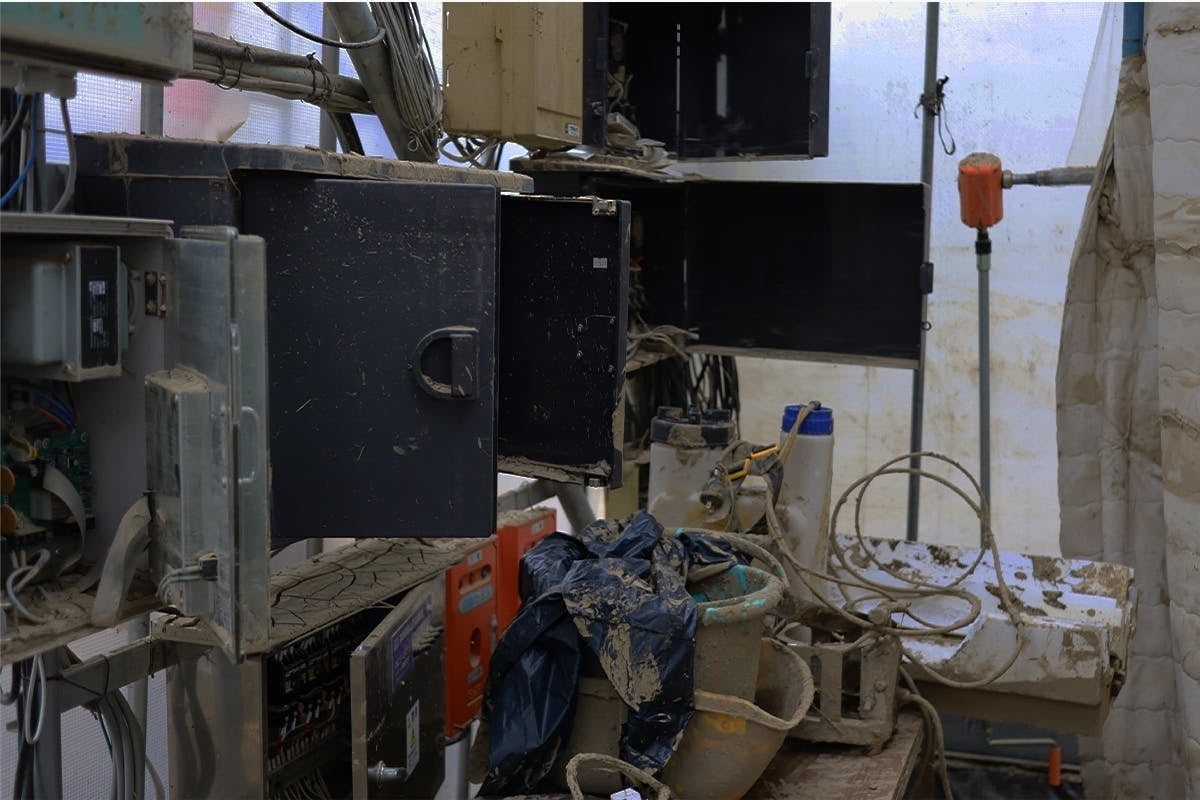 ▼ハウスを管理する機械類も泥と水で停止、ほとんどが使用不可となりました