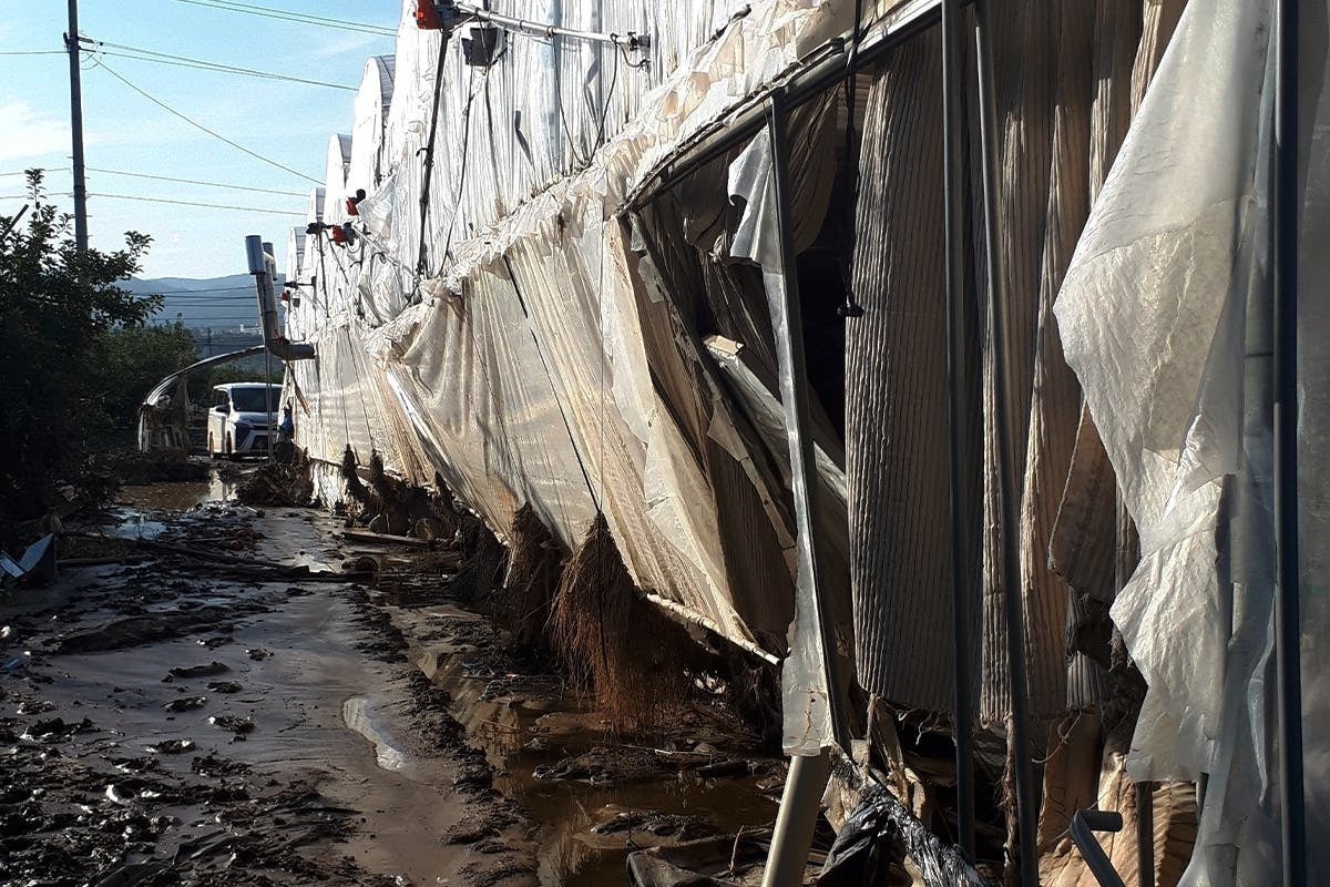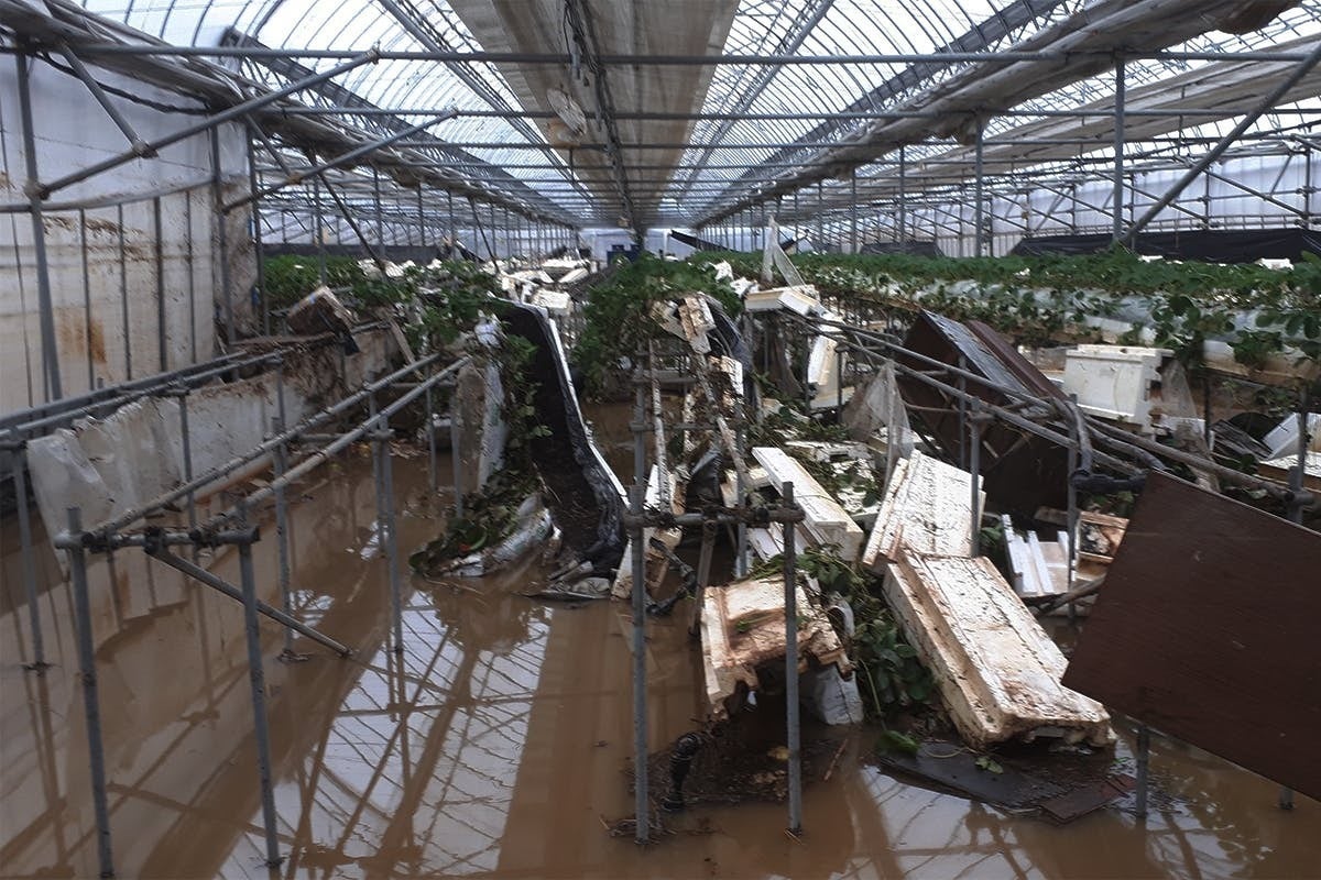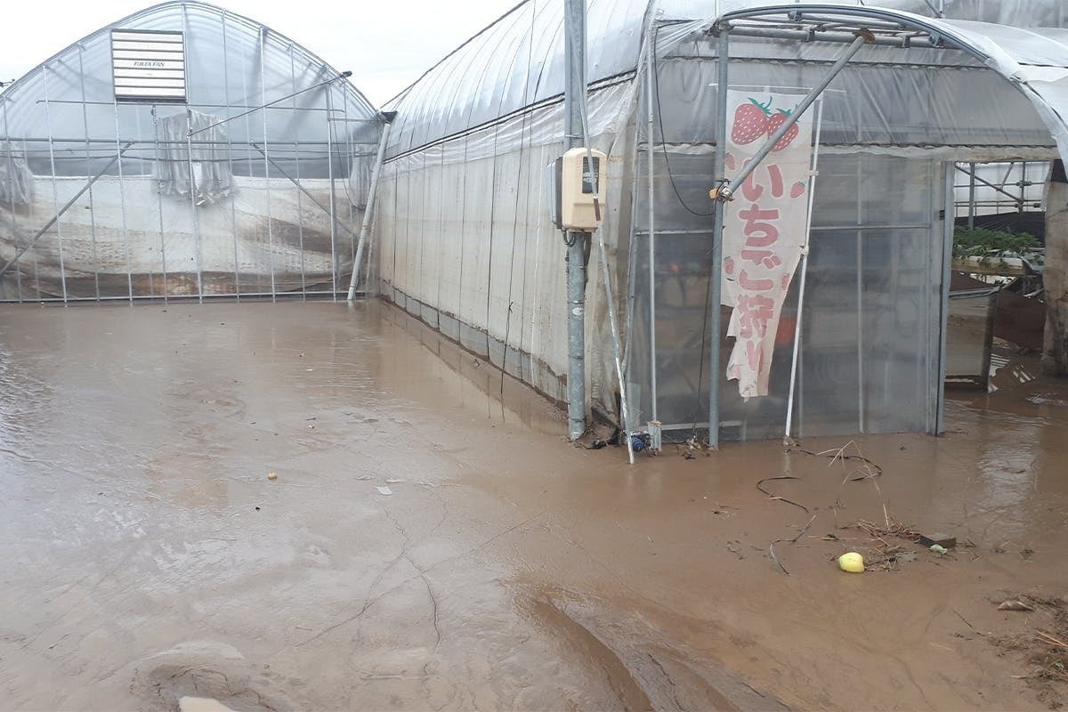 イチゴ加温ハウスが3棟、中玉トマト加温栽培ハウスが2棟、アスパラガスハウスが3棟、夏秋ミニトマトハウスが6棟、イチゴ育苗ハウス5棟、農場事務所と選別所があり、その全ての施設が濁流による倒壊や1.5~3mの浸水により大きな被害を受けました。
