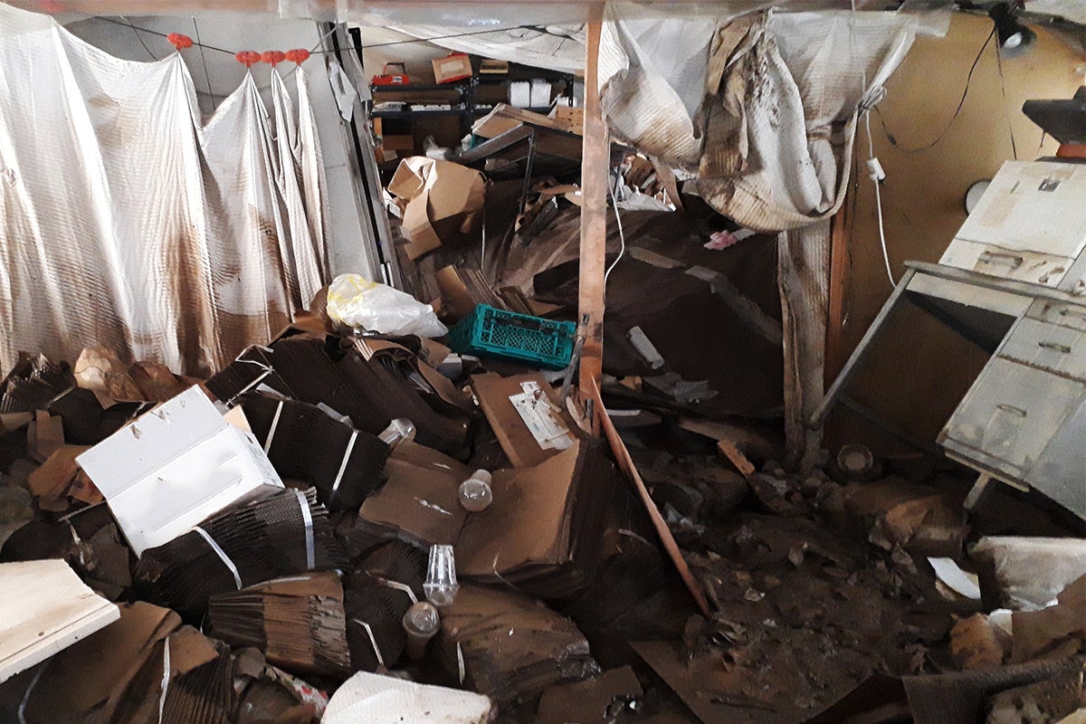 ▼浸水後、泥や水が押寄せた後、めちゃくちゃになり移転予定の選別所内の様子です