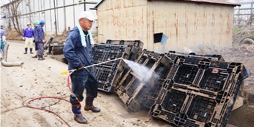 この日は、事務所と選別所の移転の準備として、パレットやブロックなどの使えるものと、壊れてしまい使えないものを処分する段取りをしていました。