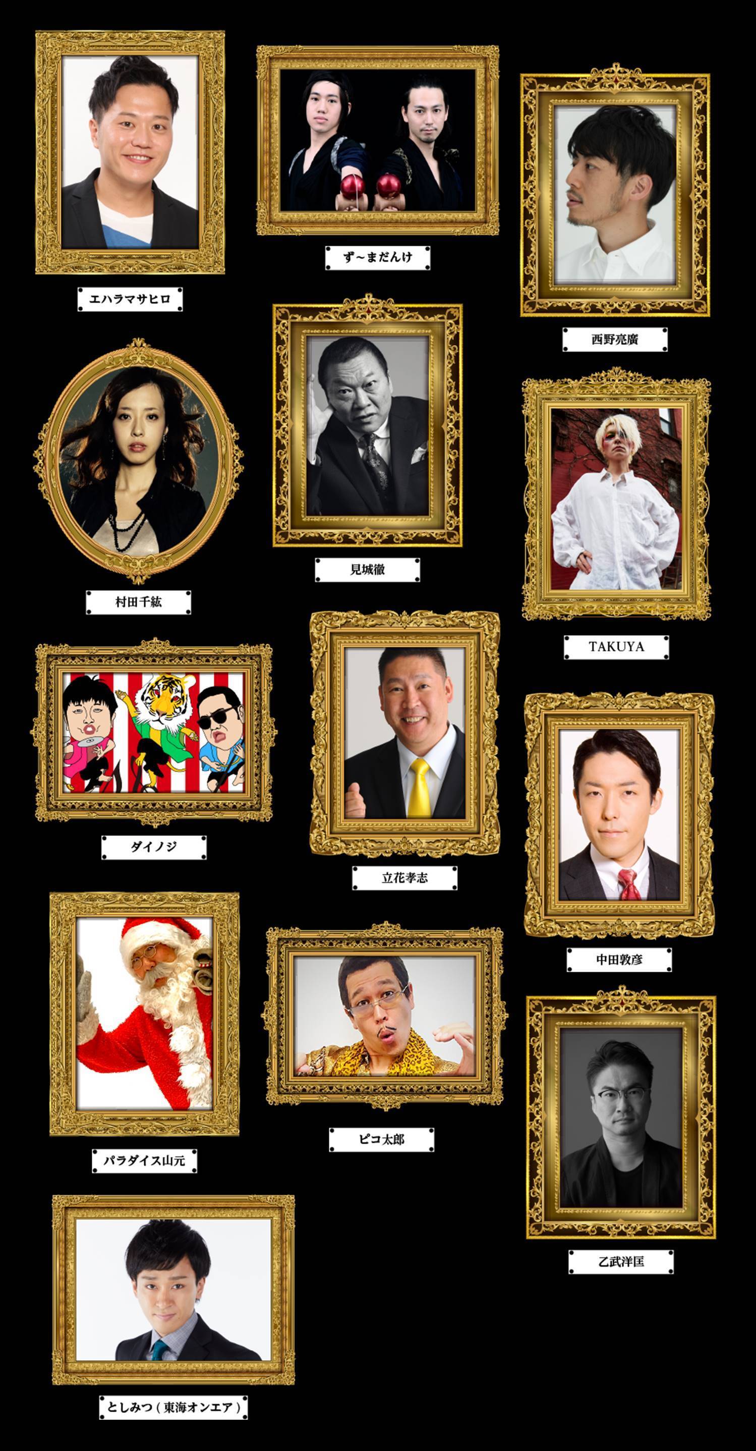 立花孝志/TAKUYA/村田千紘/ず〜まだんけ/西野亮廣(キングコング)/中田敦彦(オリエンタルラジオ)/ピコ太郎/見城徹(幻冬舎)/ダイノジ/エハラマサヒロ/としみつ(東海オンエア)他近日発表