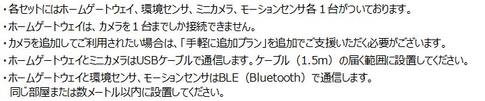 1. コメントありがとうございます。はい、ミニカメラ、環境センサ、モーションセンサ、ホームゲートウェイの4種類の機器をご購入者さまに各1台お送りします。