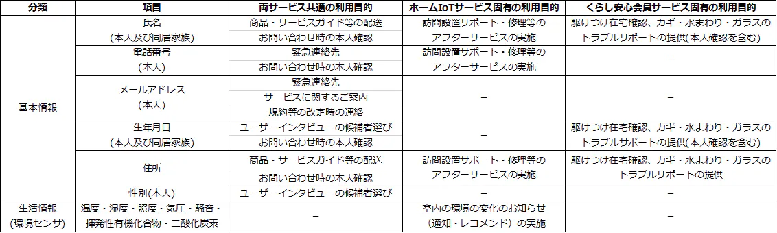 なお、本サービスで、中部電力(以下、「弊社」といいます。)が取得する個人情報の項目および利用目的は下表の通りです。