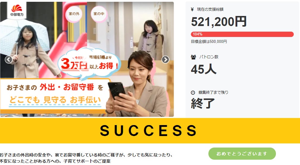 • ご支援くださいました皆様へこの度は、 「気になる お子さまだけのお留守番。どこでも手軽に見守るお手伝い 中部電力+Oh!」のプロジェクトをご支援いただき、誠にありがとうございました。昨日をもちまして本プロジェクトの募集が終了いたしました。支援者の皆さまの応援により、目標金額を無事達成し、プロジェクトを成功させることができました。本当に感謝の気持ちでいっぱいです!現在、2月の発送に向けてリターンの配送準備を開始しております。配送状況やサービスに関する重要なご案内等については、今後も活動報告にてご連絡いたしますので必ずご確認いただきますようお願い申し上げます。今後ともどうぞよろしくお願いいたします。中部電力(株)事業創造本部 プロジェクトメンバ一同※今後について■無料の訪問設置サポートについて支援の際に「無料の訪問設置サポートを希望する」をチェックされた方には、弊社サポートデスクよりお電話またはメールにてご連絡し、訪問日を調整させていただきます。ご連絡がございましたら、お手数をおかけしますが、ご回答のほどお願い申し上げます。■「くらし安心会員サービス」について「くらし安心会員サービス」のご加入に必要な情報は、弊社から本プロジェクトサイトを通じて入力フォームのご案内をさせていただきます。 その際、お手数をおかけしますが、必要事項を1月20日(月)までにご入力頂きますようお願いいたします。<対象者>プランB(どこニャン割付きスタートパックプラン)9,600円プランD(スタートパックプラン)12,000円 もっと見る