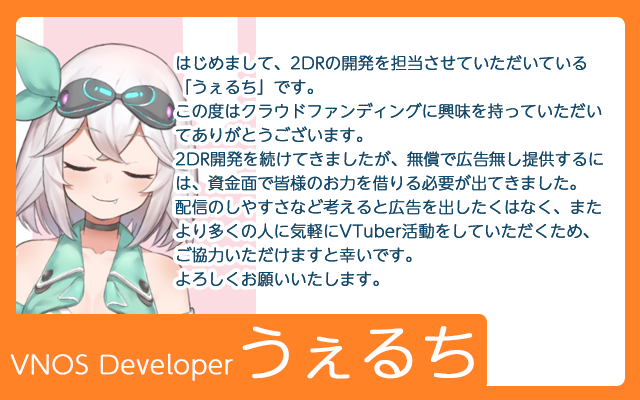 また3万円のリターンのミートアップですが、2DRや、アバターを用いた社会について、大いに話し合える機会を設けたいという一心で作成いたしました。なかなか時間を作れないのが現状ではありますが、できる限り少数でのミートアップで親密な時間を過ごしたいと考えております。(支援者数によっては複数回行われる可能性があります)