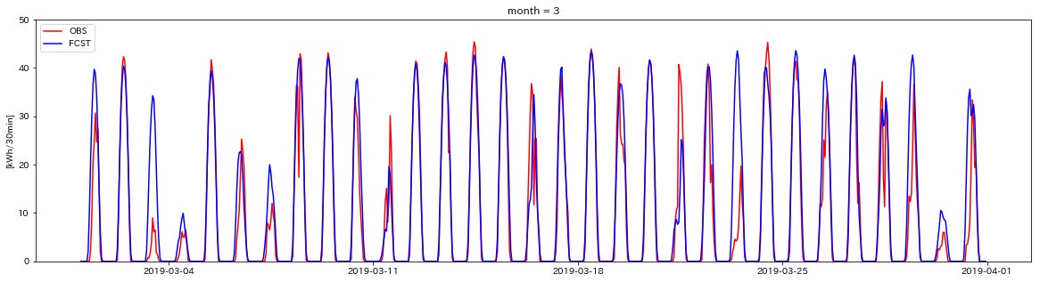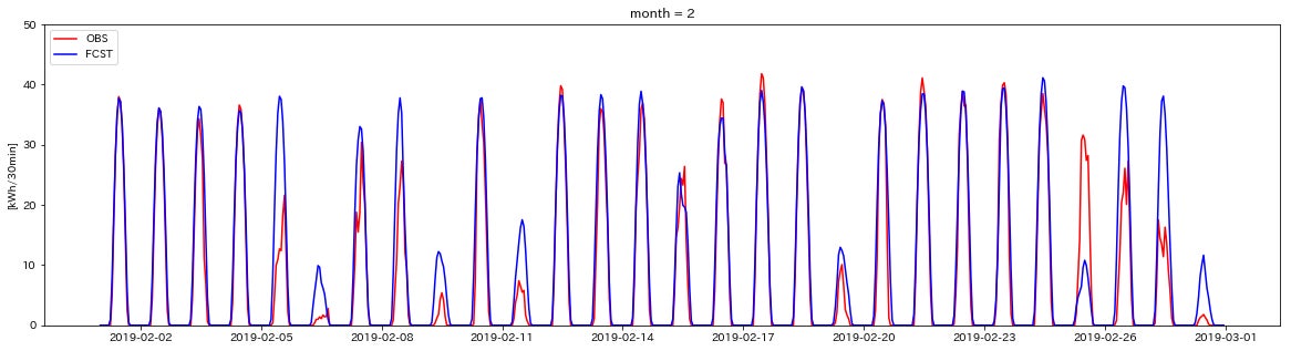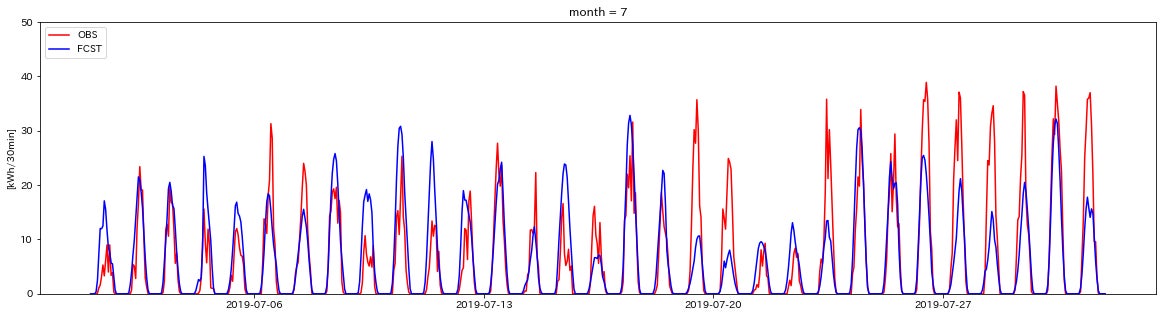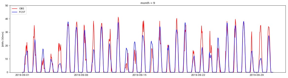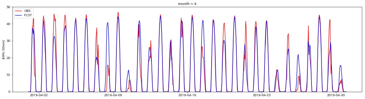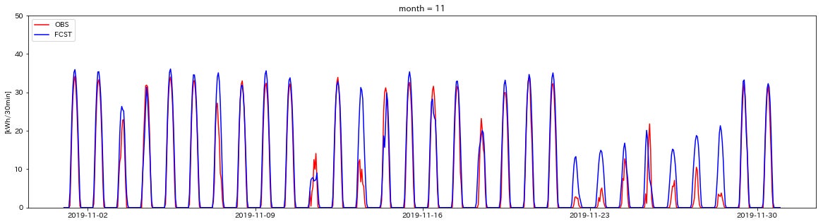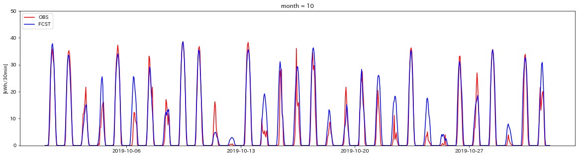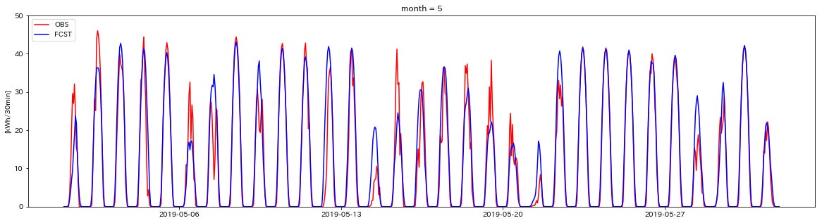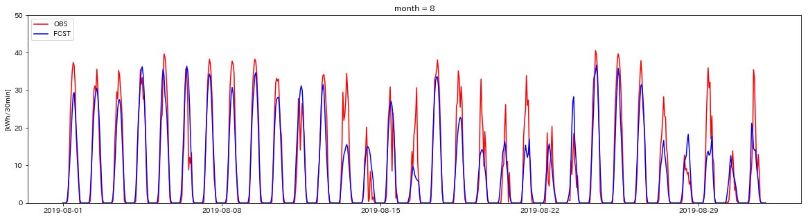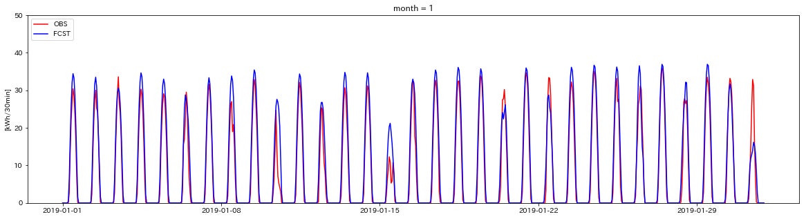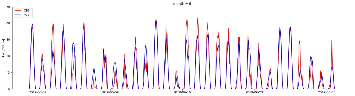 ひとつの発電所に対し35[km]も離れた場所の気象予測データをインプットにしているため不利な条件であるものの、同じ一次細分区域内なので天気傾向は概ね一致します。