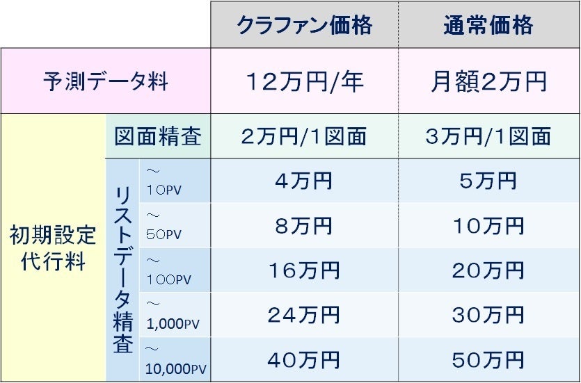 初期設定を私たちに委託される場合、1予測につき予測値データ料12万円(1年分)と初期設定代行料の合算となっています。