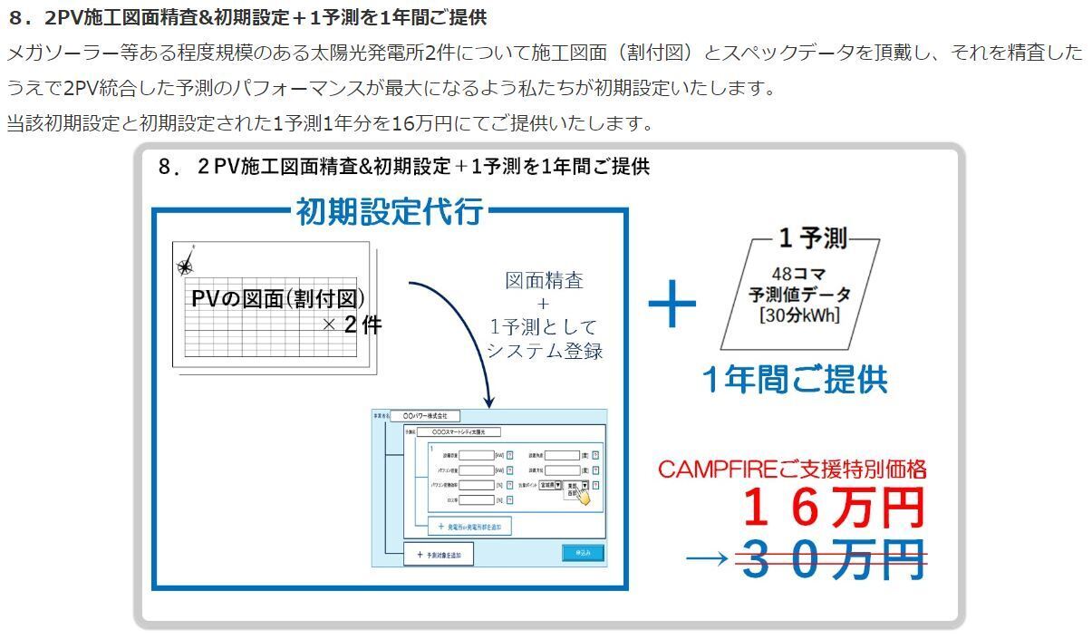 例えば、1[MW]の太陽光発電所2件を中心としたマイクログリッド実証の場合、これらの発電所の施工図面(割付図)をお借りして、太陽光パネルの設置角度・方位を正確に読み取り、スペック情報(設備容量やパワコン容量・変換効率)や、過積載の有無を判断・精査し、さらに、それぞれの発電所の住所から最適地点の気象予測データとを紐付けして、これらの情報を予測設定に入力する作業までを初期設定代行料として4万円(2万円×2件)頂戴し、年間予測データ料12万円と合算で16万円の設定(リターン8、下図)にしています。