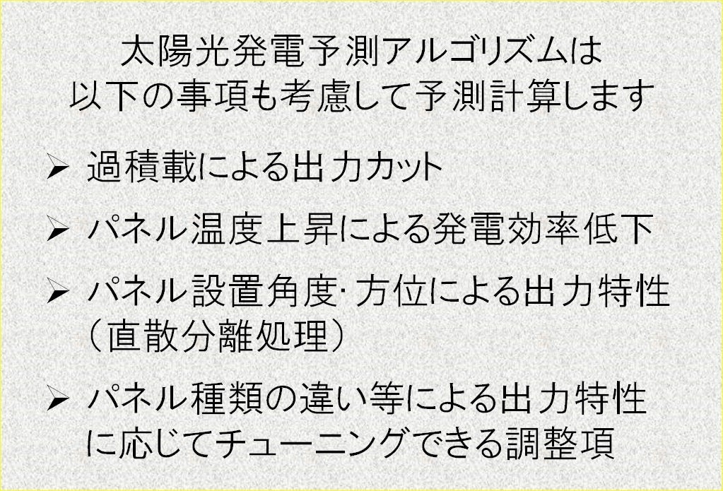太陽光パネルの種類は、多結晶やCIS等たくさんあることはもちろん承知していますが、これらの出力特性もアルゴリズムの中で平均化しています。