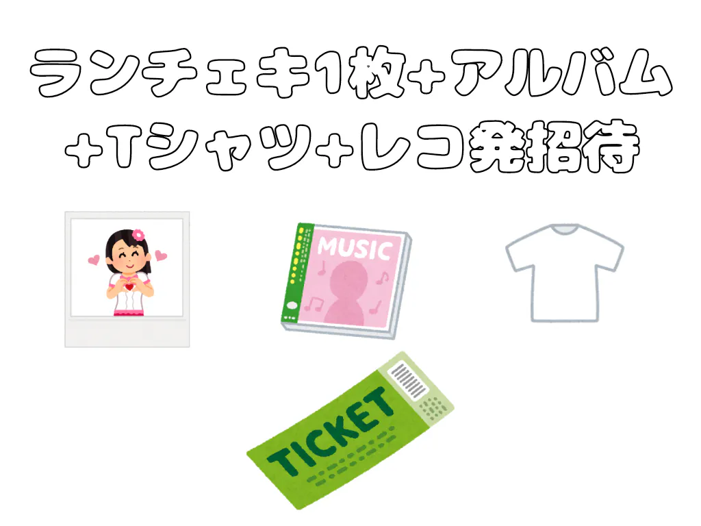 ランチェキ1枚+アルバム+Tシャツ(白、XLサイズのみ)+レコ発招待券(2020年3月、都内某所で行う予定です。交通費は自己負担でお願い致します。)