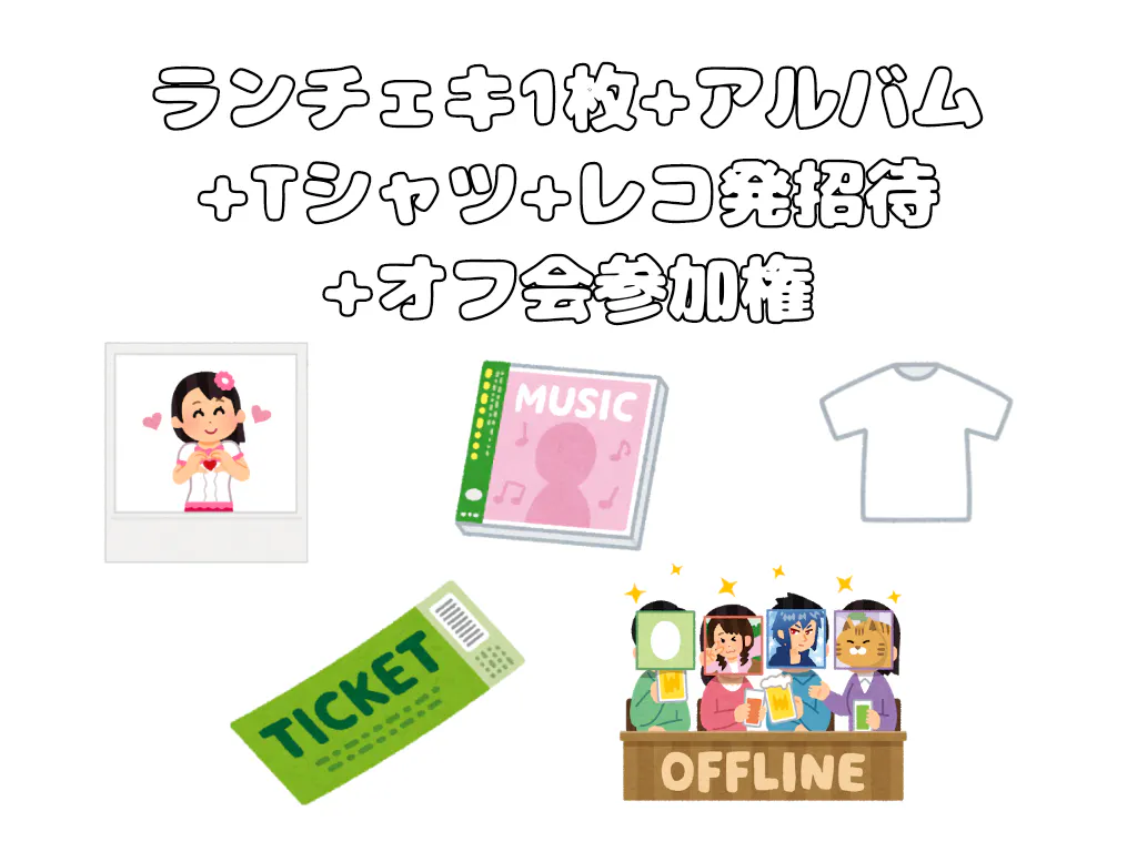 ランチェキ1枚+アルバム+Tシャツ(白、XLサイズのみ)+レコ発招待券(2020年3月、都内某所で行う予定です。交通費は自己負担でお願い致します。)+オフ会参加権(2020年3月、都内某所で行う予定です。交通費、参加費は自己負担でお願い致します。)