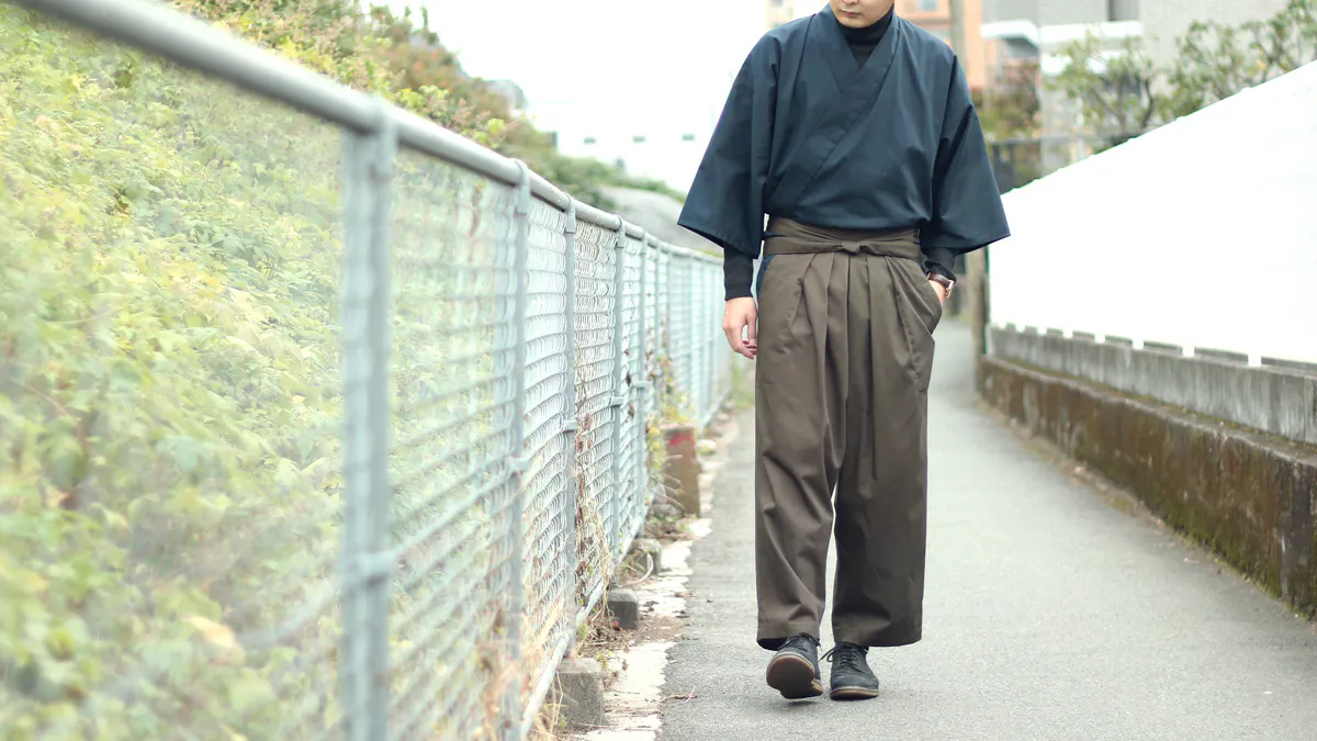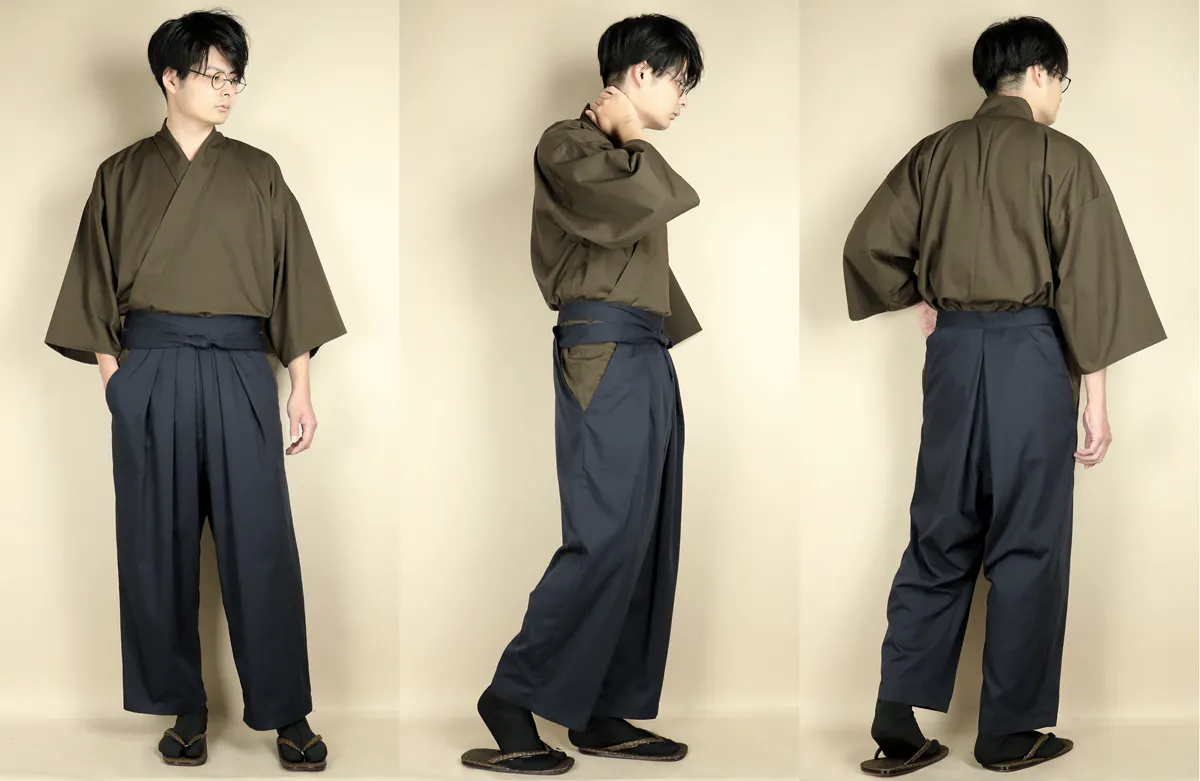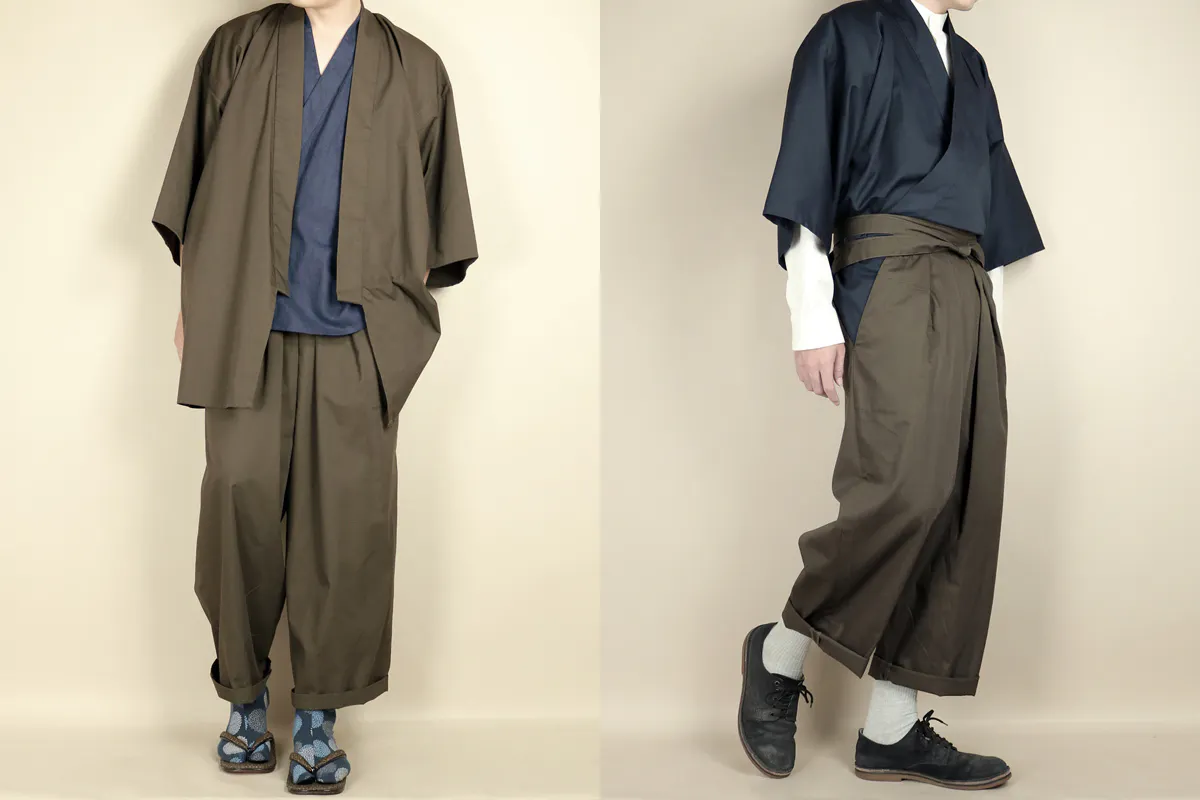 日本古来の野袴(のばかま)を現代的にアレンジして、チノパンの生地で製作した男性用の袴パンツです。