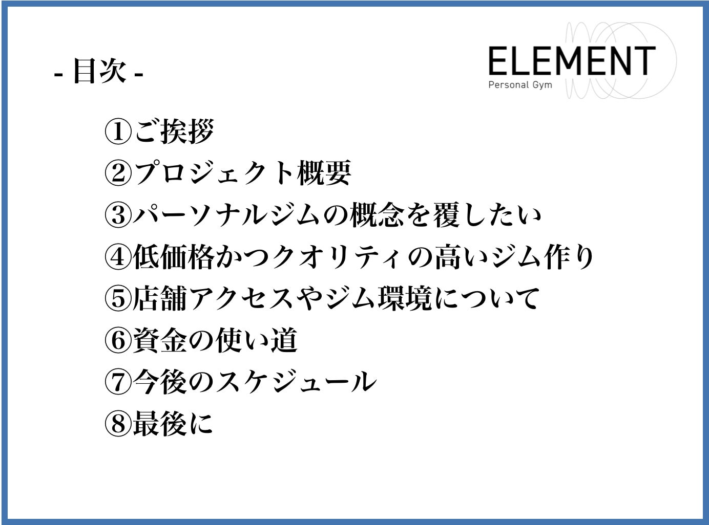 このプロジェクトで実現したいことは、「皆さんの日常の一部となる通い放題のパーソナルジム『ELEMENT(https://element-gym.com/)』 」を設立することです。