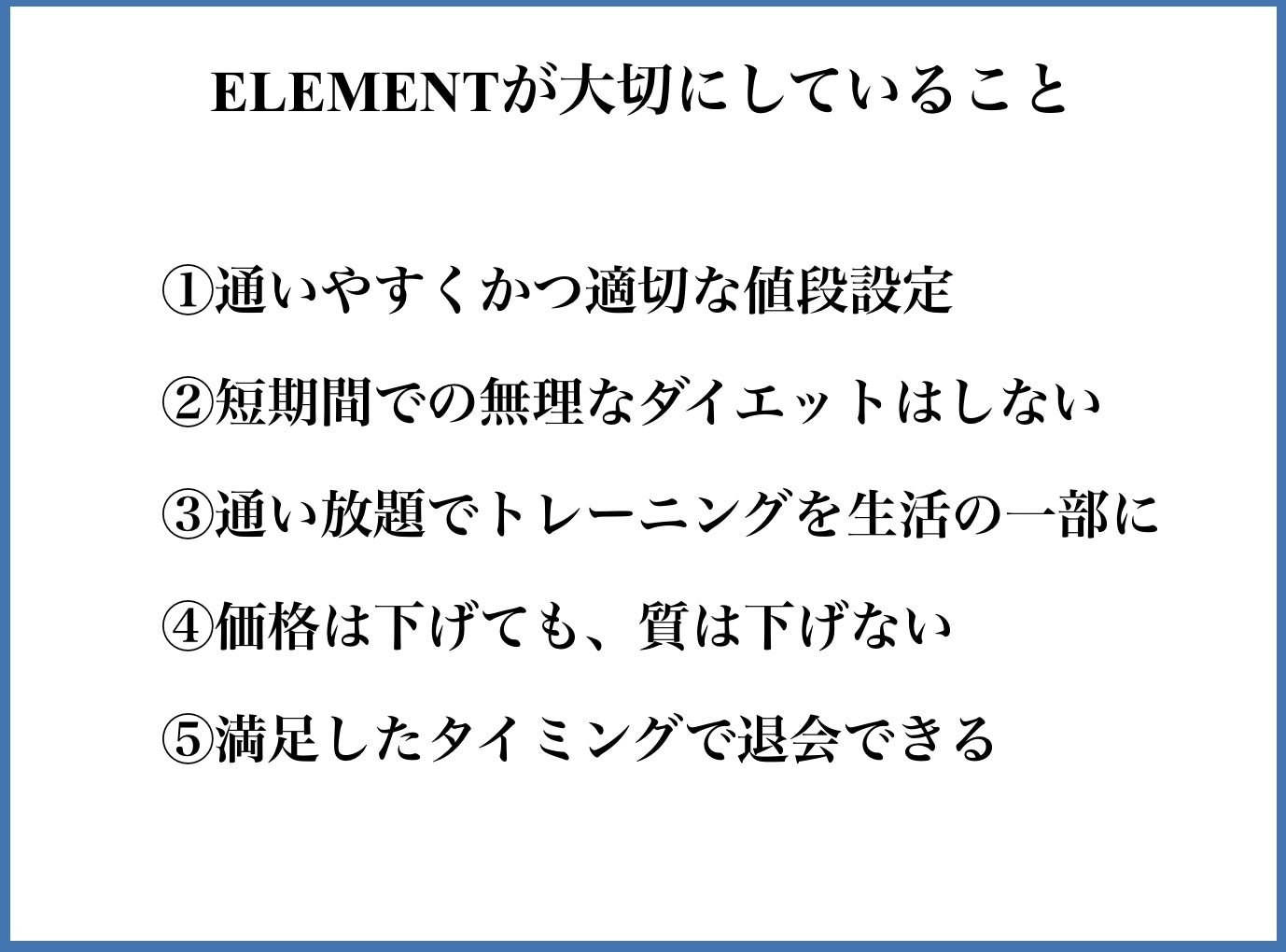 しかしながら、ELEMENTというパーソナルジムはどんな人にとっても居心地が良く、そしてどんな人に対してもまた来たい!と思ってもらえるようなジムにしていくことを目標とします。