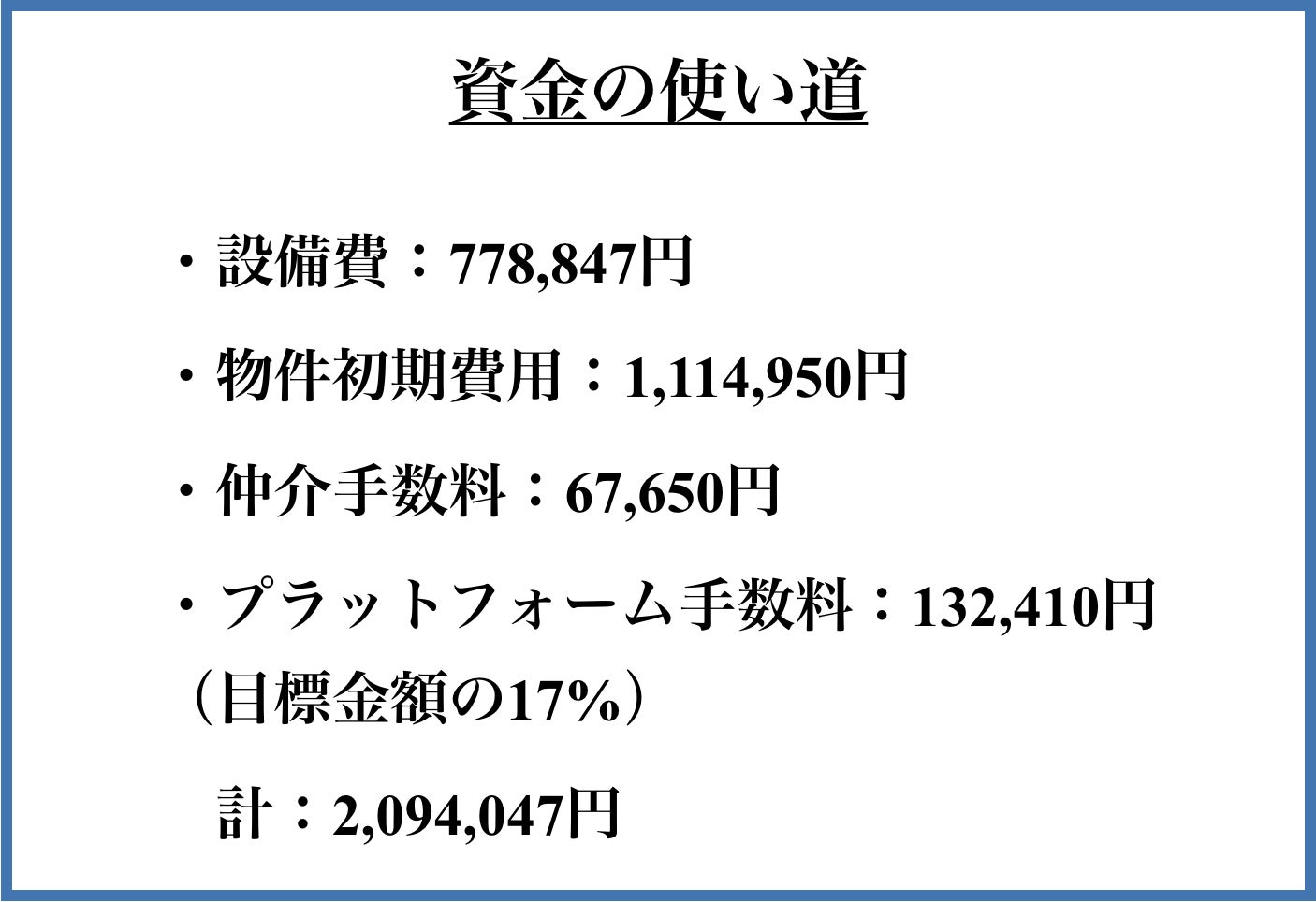 ※支援額がオーバーした分は上記の内訳にあるように「物件初期費用、仲介手数料、プラットフォーム手数料」等のパーソナルジム開設時にかかった初期費用や運営費に充てさせて頂きます。