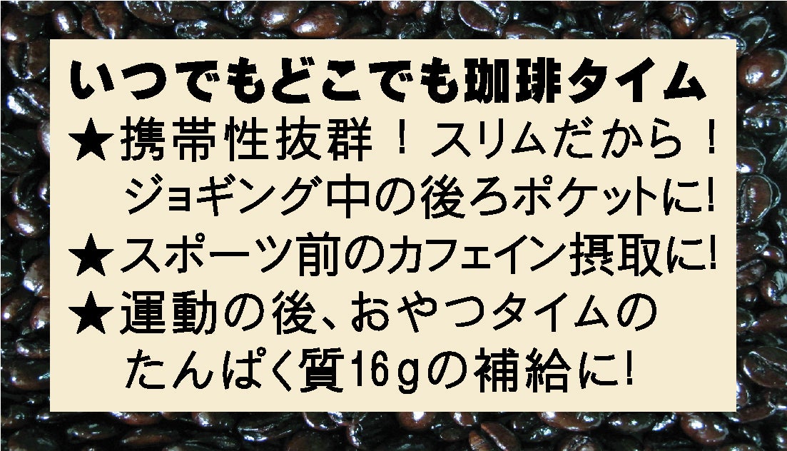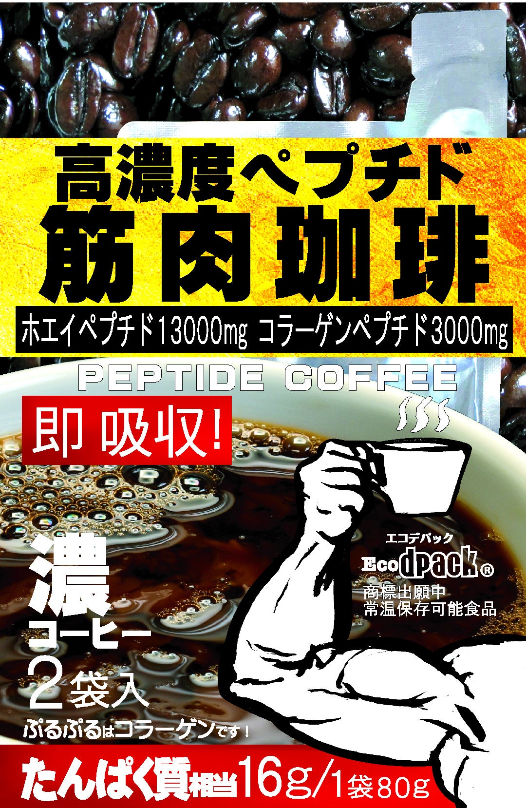 筋肉珈琲 とは・・・・・プロテイン(たんぱく質)を酵素分解してプロテインより消化吸収しやすくしたホエイペプチドとコラーゲンペプチドを合計16g、世界初のキャップ無し気密パウチ(エコデパック)に入れた常温無菌レトルト濃厚コーヒーの事です! 商標登録出願中!