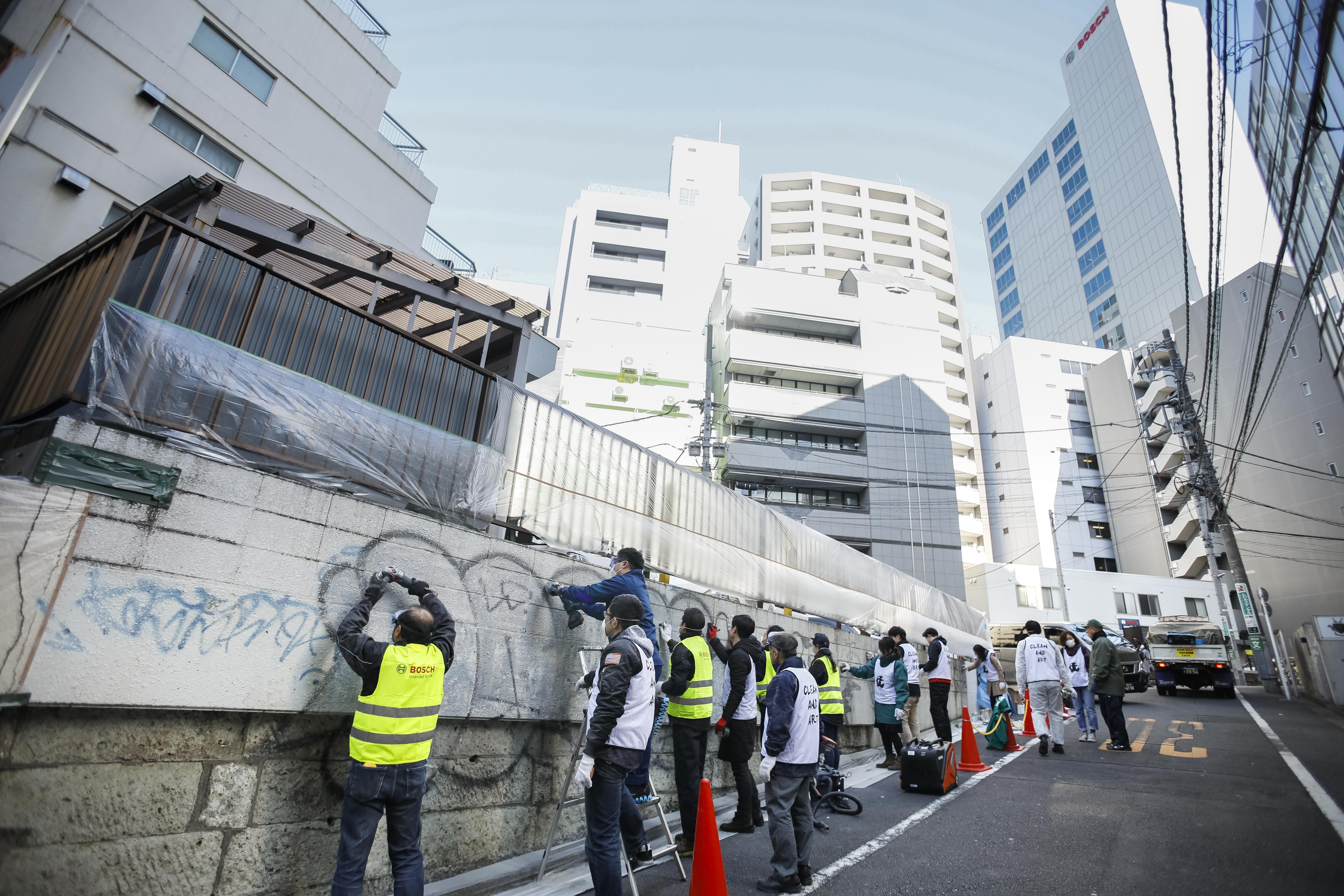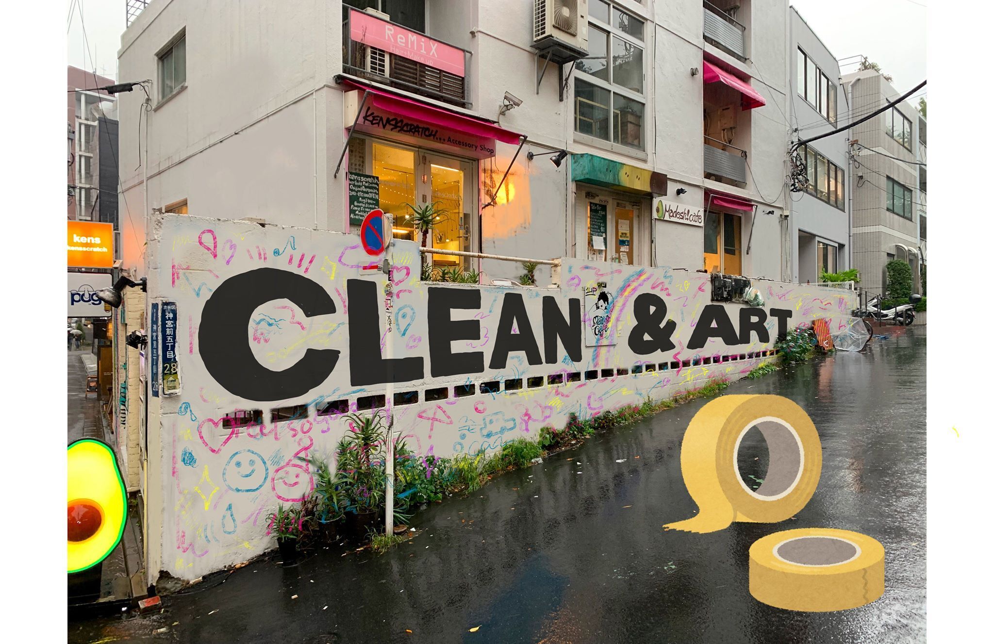 その第一弾として、2019年12月に渋谷のキャットストリート近くの建物の落書きされたブロック塀を舞台に、CLEAN&ARTなプロジェクトを実施いたします。ブロック塀をプロジェクトに参加してくださった皆様と一緒に、マスキングテープを使用したアート壁画の制作を行い、一連の流れをPVとして撮影し、世界中に発信していきます。マスキングテープは最後に剥がします。映像として記録に残した後は綺麗な状態にして、日本特有の「侘び寂び」「刹那」を体現するアートプログラムになっています。