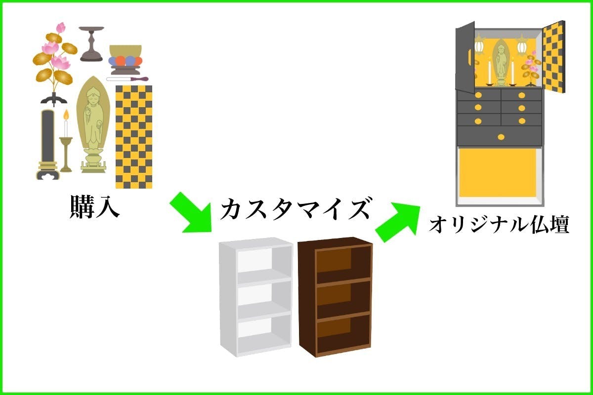 そのサイズに合わせた、壁紙や、シールなどをプロアマ問わず個人やデザイナーによってデザインされた物を置いたり、貼り付けたりして、仏壇を仕上げていくものです。