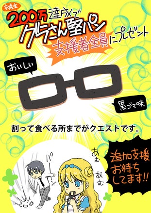 ありがたいことに開始早々目標金額の達成となりました…!まずはご支援下さった皆さんに感謝申し上げます。プロジェクトページにもある通り、目標金額は最低限必要な金額でして…カバーをつけたり、アシスタントさんたちに十分な謝礼を渡したりを考えるとまだまだ心もとない状態です。プロジェクトのコース応募は3月11日までなのでまだ半月以上の時間があります…ですので、このまま支援を呼びかけて次は目標金額200万300万を目指して行きたいと思います。そこで、当面の目標として200万達成のストレッチゴールを決めました!グラさんの全プレです。殉職したあの人気キャラが貴方のお手元に…!ちなみに再び割って食べる所までが一通りのクエストなのでよろしくお願いします。というわけで追加支援申し上げる!!!よろしゃす!
