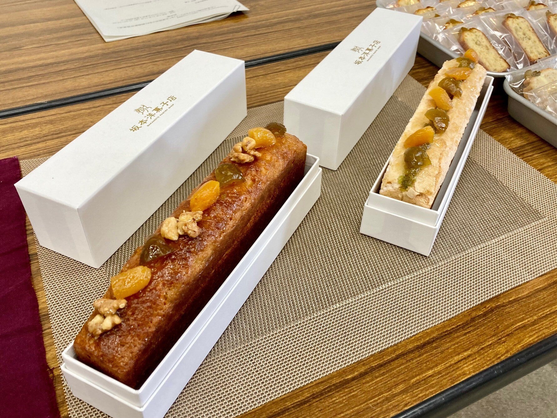 そしてこの度、この坂本八幡宮の隣に位置する太宰府政庁跡で採取された梅の実を使ったスリムパウンドケーキ2種類制作して販売を開始します。こちらは少し前になりますが太宰府市の企画で太宰府の梅を使用した商品開発発表の場にて撮影された商品になります。