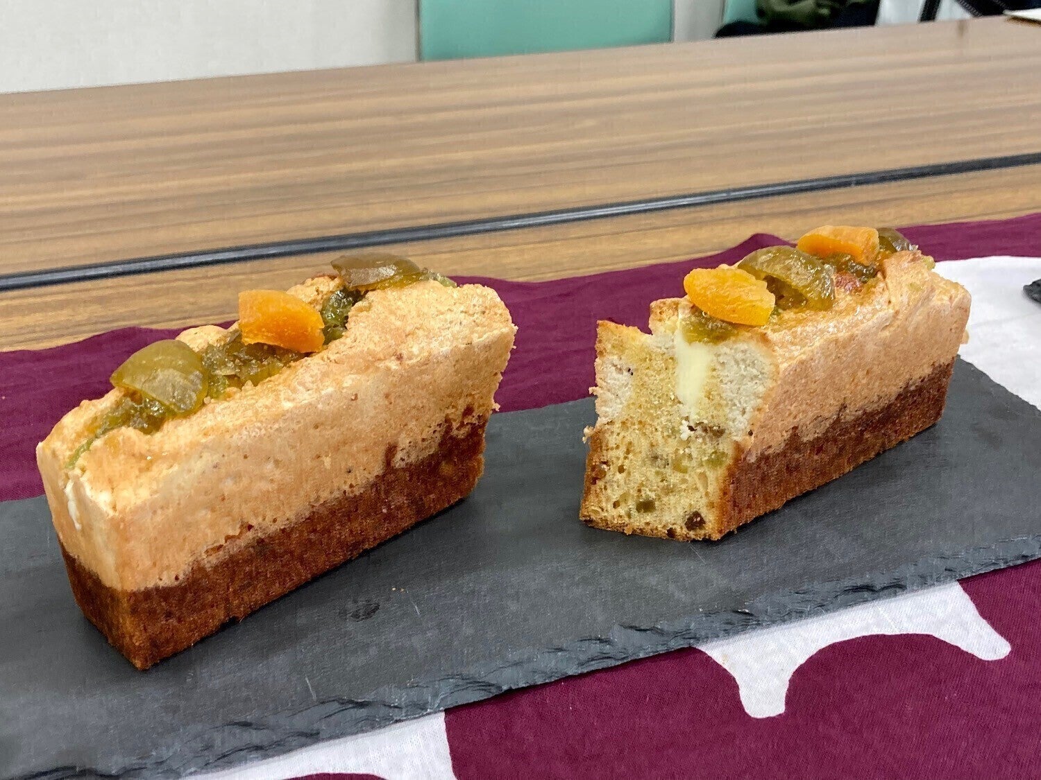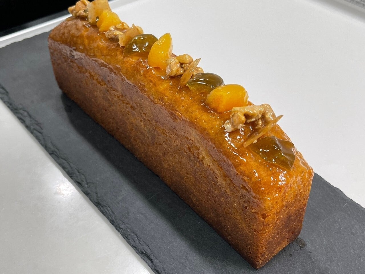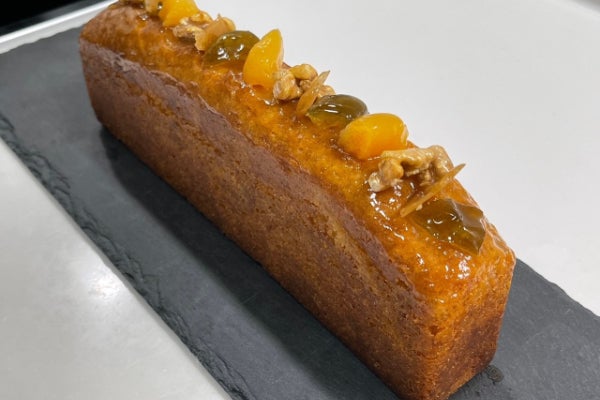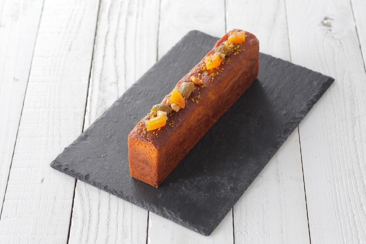 生地はしっとりとしたパウンド生地と上がダコワーズ生地の2層タイプがあり生地には梅のコンフィチュールとセミドライを合わせたものが練りこまれています。焼き上げ後すぐに梅のシロップを打ちセミドライの漬け込み梅をナッツ等と一緒に飾りました。
