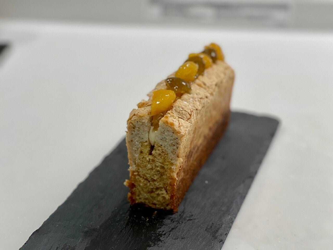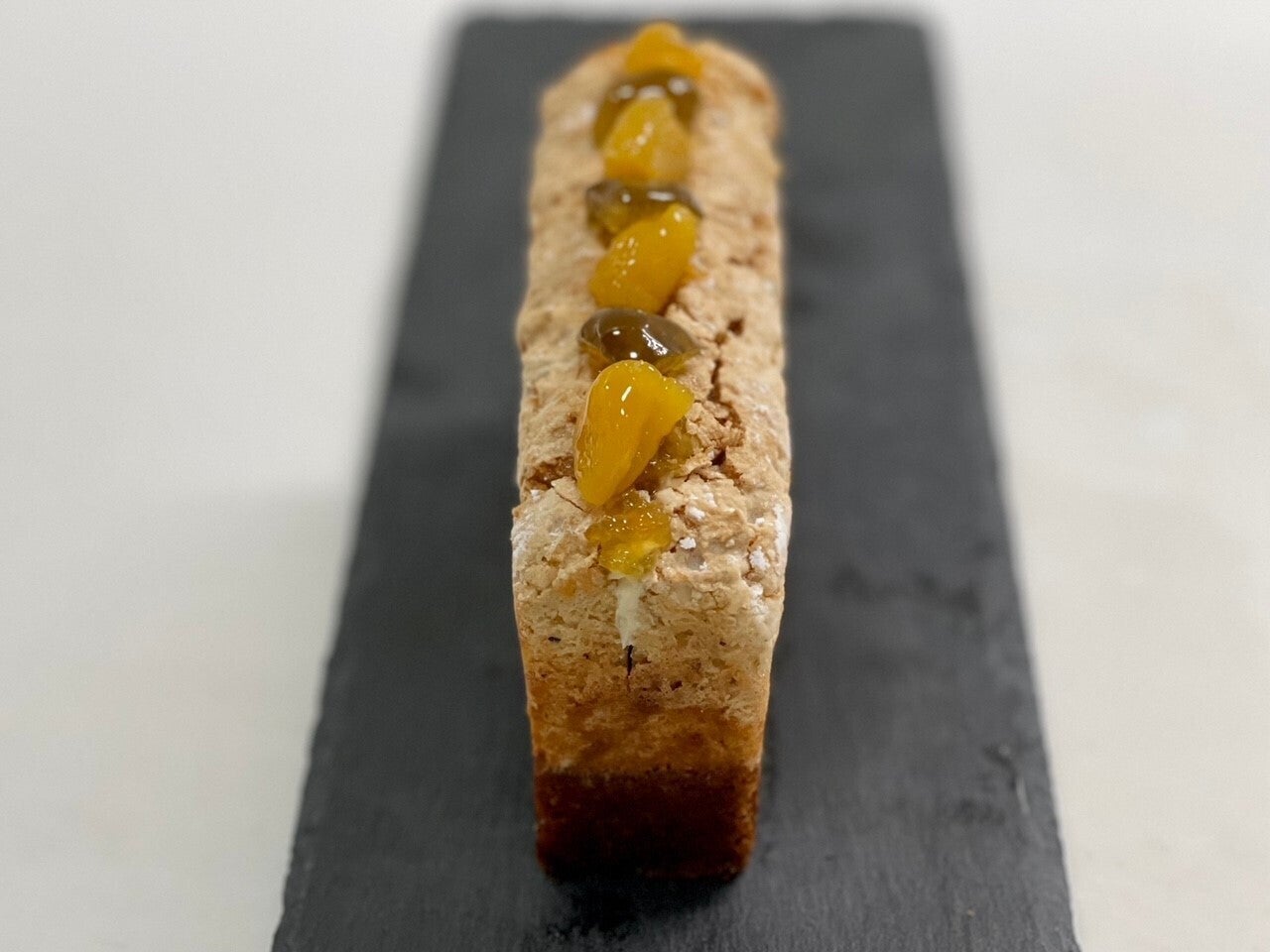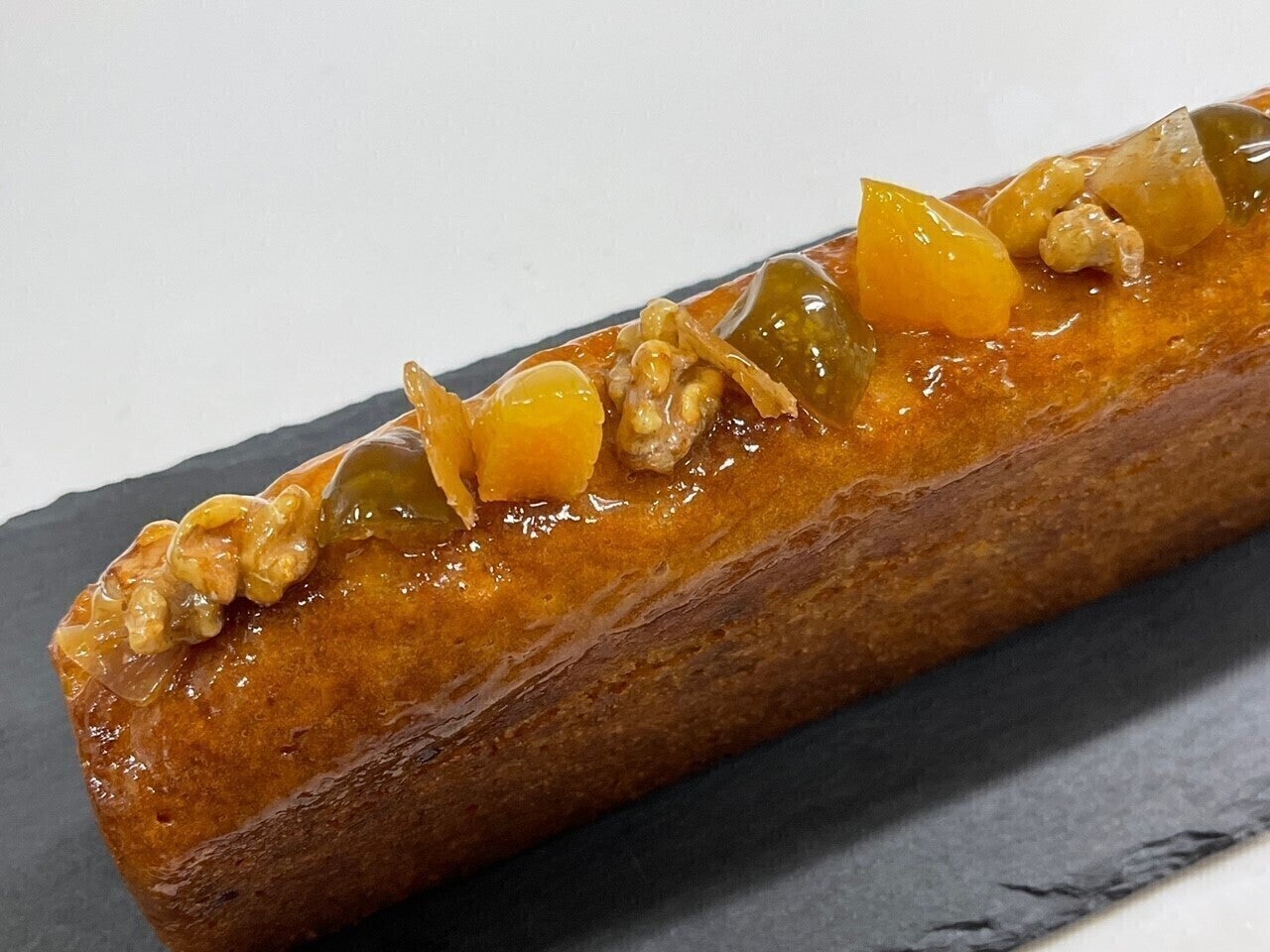 生地はしっとりとしたパウンド生地と上がダコワーズ生地の2層タイプがあり生地には梅のコンフィチュールとセミドライを合わせたものが練りこまれています。焼き上げ後すぐに梅のシロップを打ちセミドライの漬け込み梅をナッツ等と一緒に飾りました。