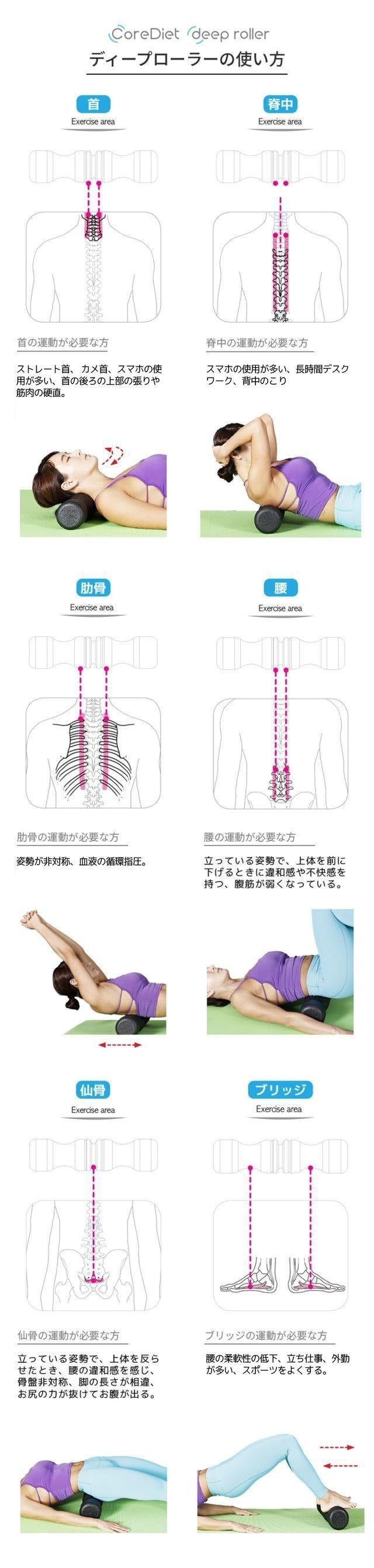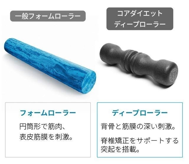 一般的なフォームローラーは筋肉の筋膜の刺激を与えますが、コアダイエットディープローラは、脊椎の関節構造を力学的分析をして、背骨や筋膜を奥深くに刺激するよう設計されました。自分の体重を乗せて指圧しながら、脊椎(首、背中、腰、骨盤)の関節を正しくケアするように設計されました。