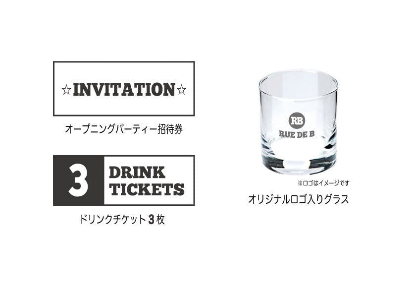・1万円:オープニングパーティにご招待、ドリンクチケット3枚、オリジナルロゴ入りグラス