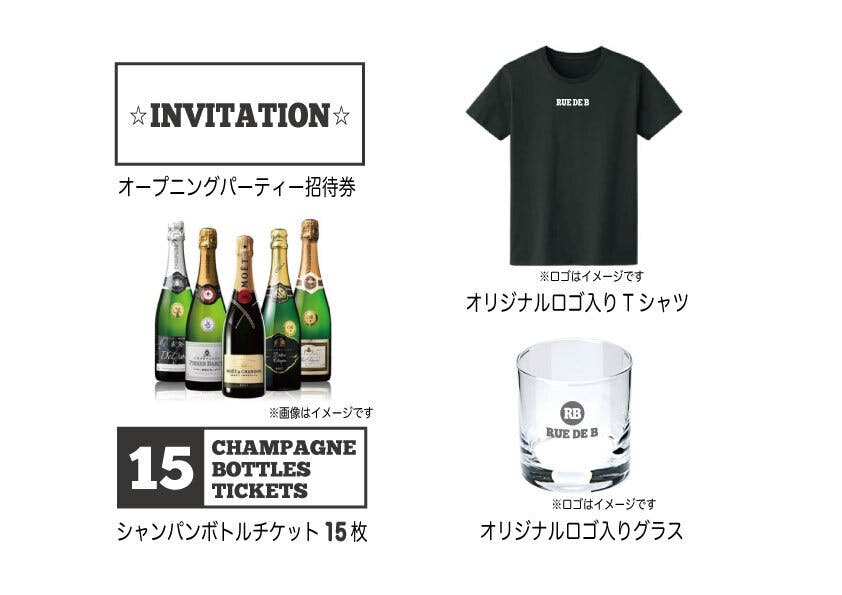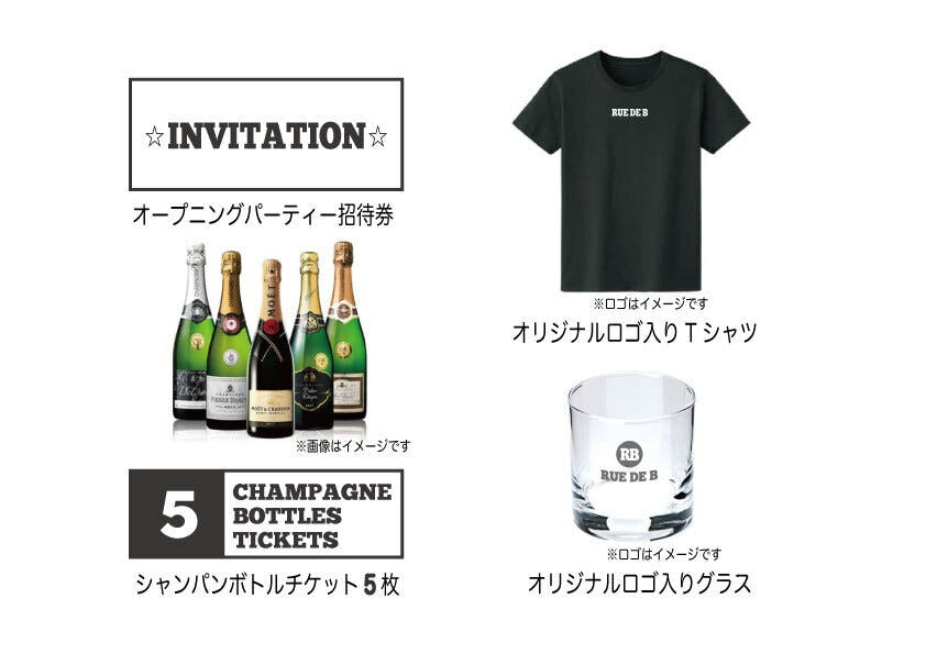 ・10万円:オープニングパーティにご招待、シャンパンボトルチケット5枚、オリジナルロゴ入りTシャツ、オリジナルロゴ入りグラス