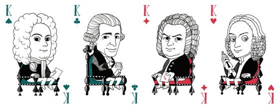 キングの4人です。 【スペード】音楽の母 ヘンデル 【クローバー】交響曲の父 ハイドン 【ダイヤ】音楽の父 バッハ 【ハート】四季を作曲した ヴィヴァルディ ※数字の位置や、フォントなど、今後若干の微調整を加える可能性があります。