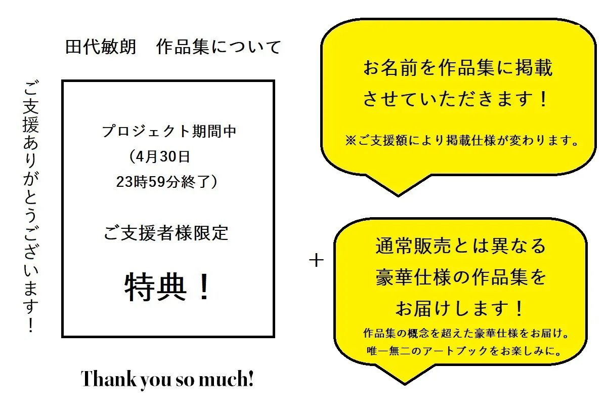 初版数の中でも、プロジェクト期間中にご支援してくださった方限定の豪華仕様の作品集をお届けします!詳細はプロジェクト終了後随時お知らせします。