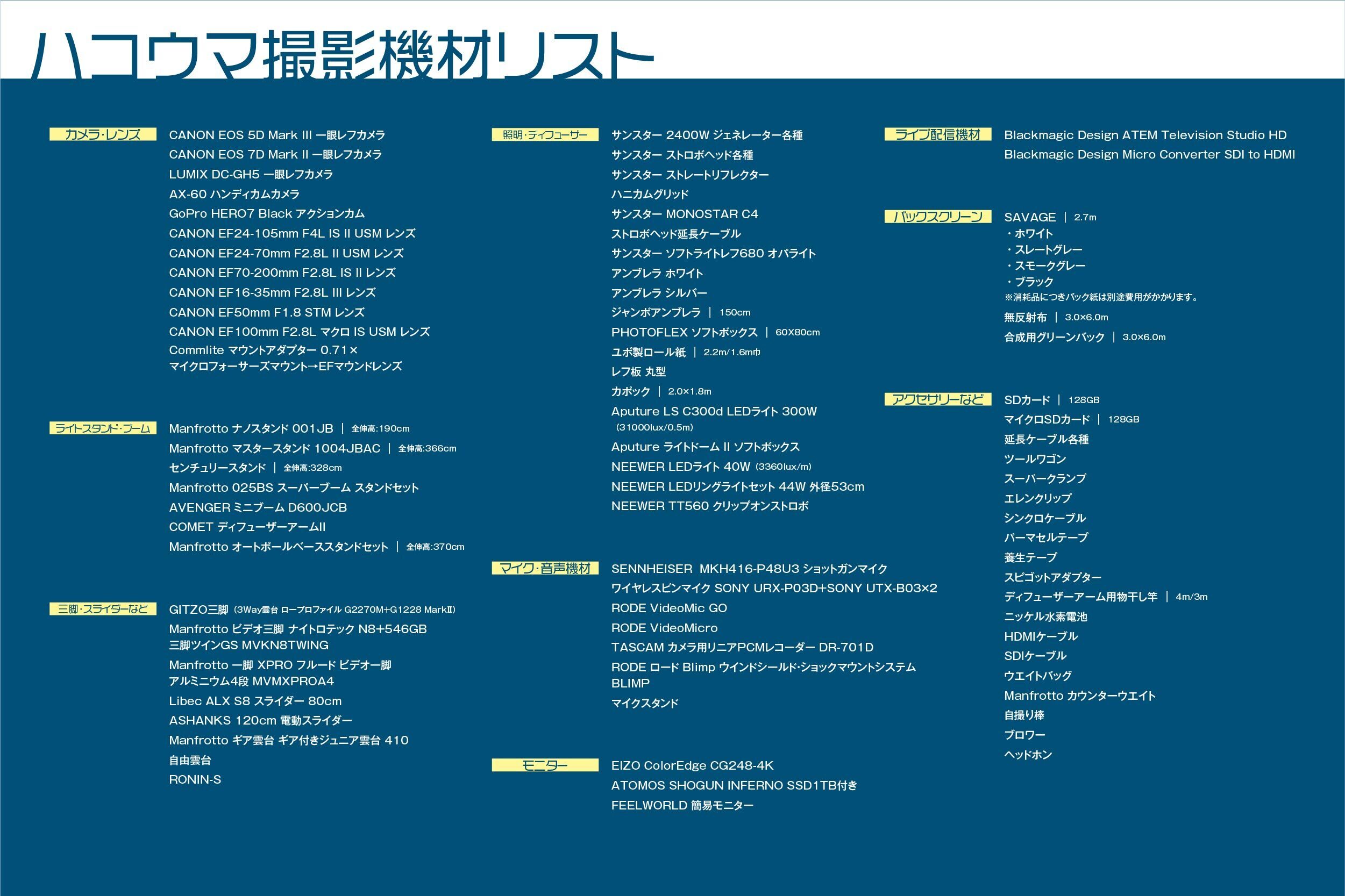 ハコウマは、制作会社であるBALUE, Inc.が「自分たちが実際の現場で使うもの」を中心にそろえているので、基本的な撮影であればすぐに始めることができます。