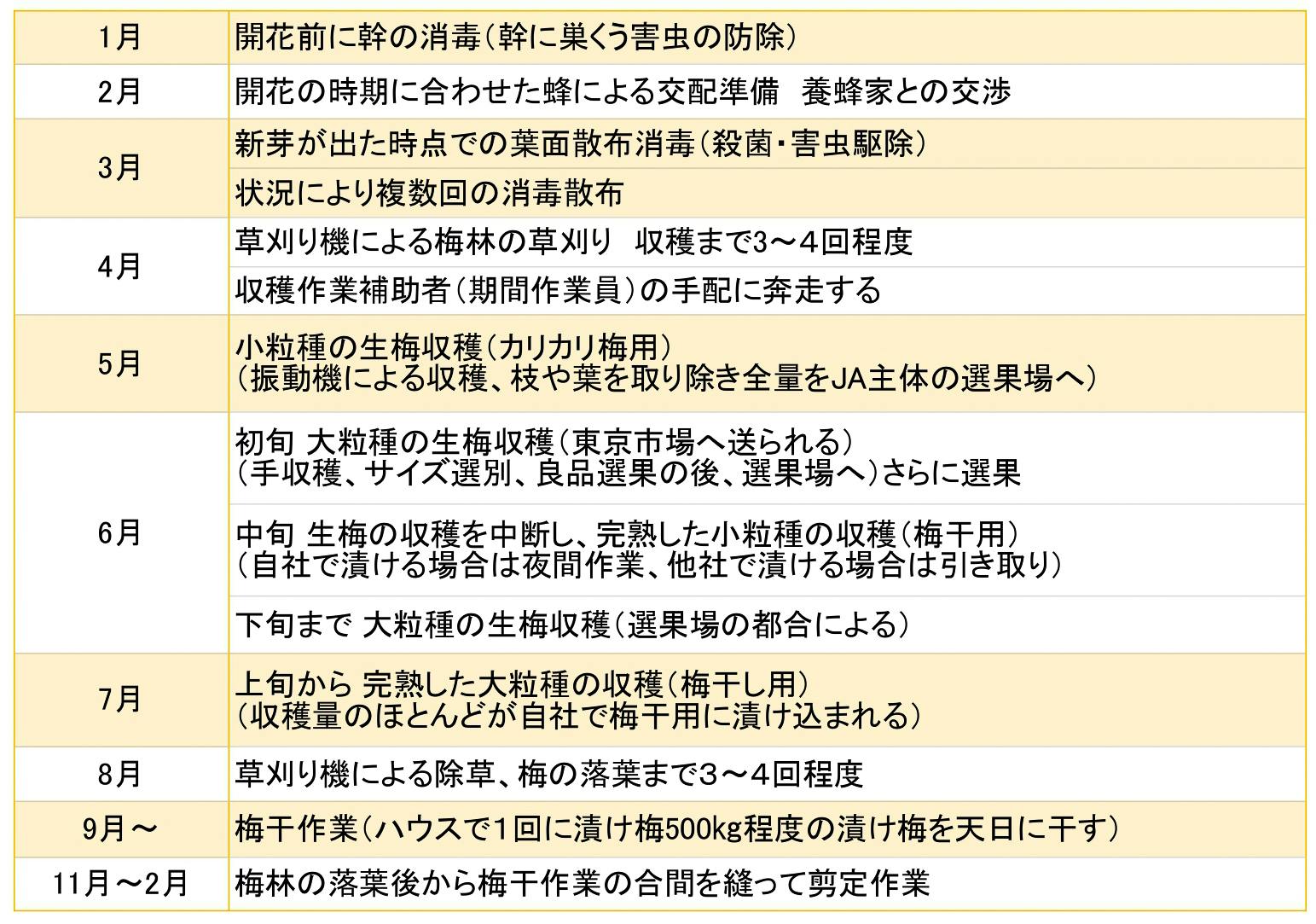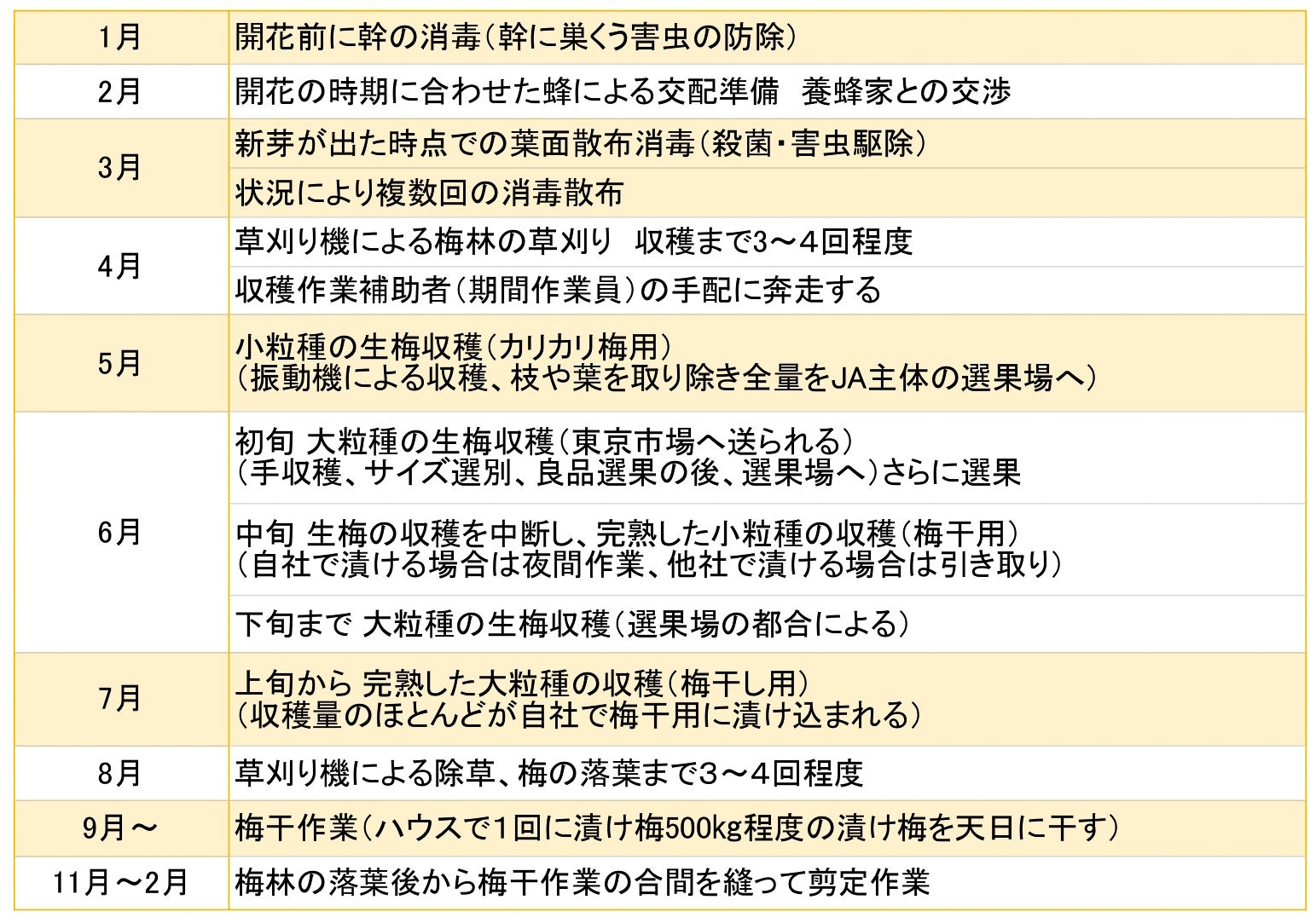 これは久留馬梅次郎本舗での1年のお仕事の流れです。小梅の織姫、大粒の白加賀の2種類を育てています。