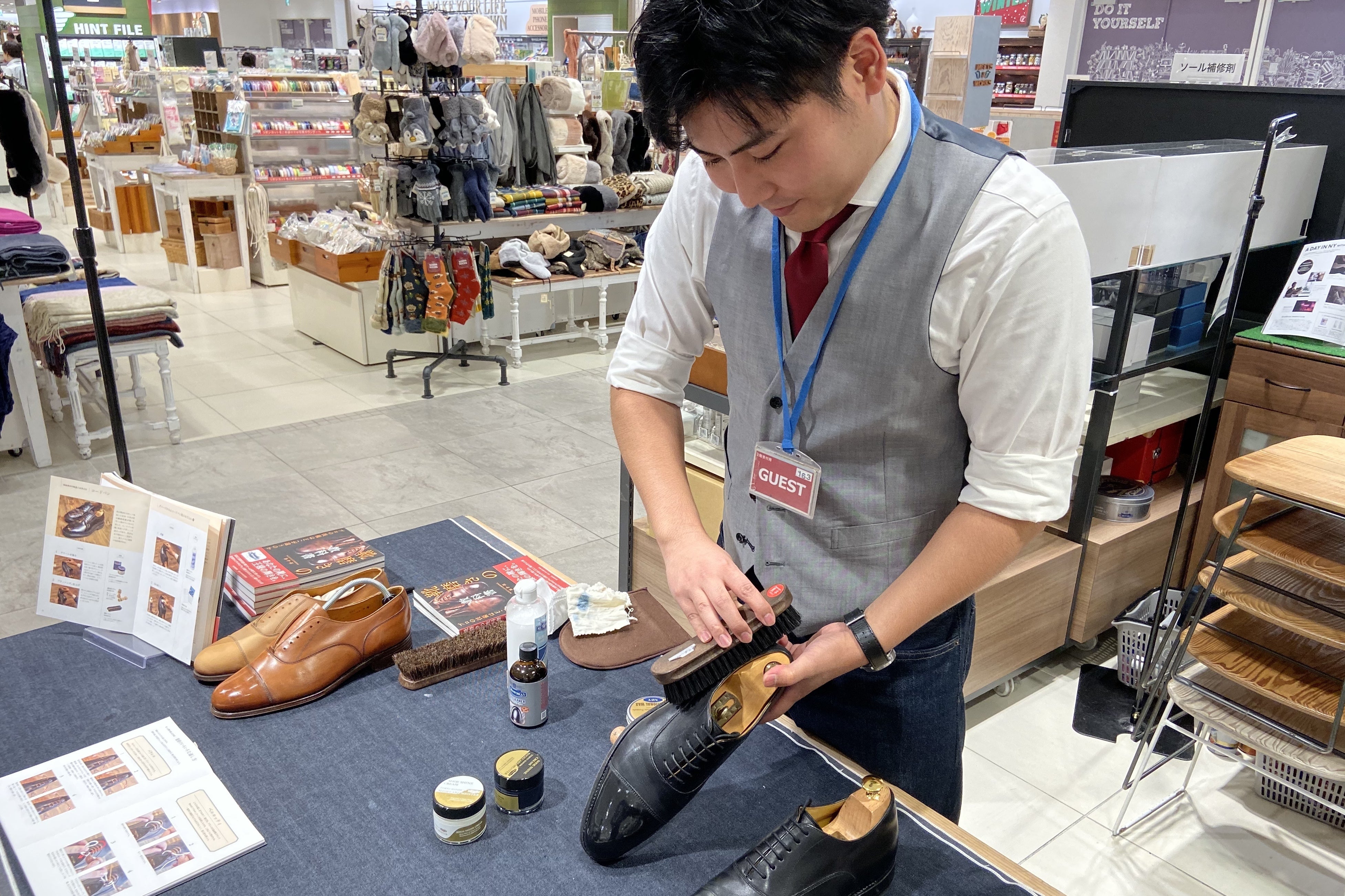 当店は店頭でのメンテナンスはもちろん、靴磨き初心者の方が自宅でもケアができるように、「なぜ靴磨きをしなければいけないのか」「どう言う手順で靴磨きをおこなうのか」などを分かりやすくご説明させて頂き、適切なケア用品をご提案をさせて頂きます。