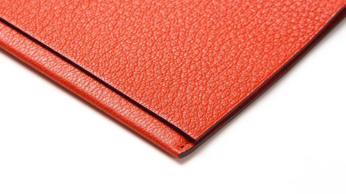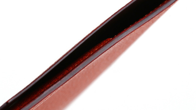 皮革製品の贅沢と言われる【ベタ貼り】という技法を使っています。それぞれの繊維方向の違う2枚を貼合わせる事で非常な堅牢度が出るため、極薄なものを作る事ができ、とてもしなやかな柔軟性が生まれます。