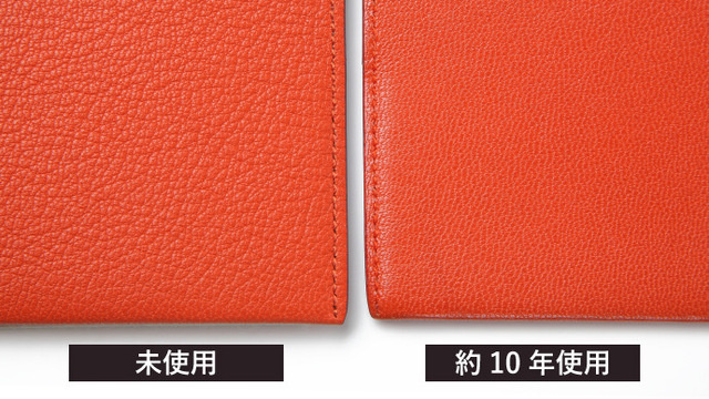 牛革に比べると薄く柔らかいため、型崩れなどを起こしにくいのが特徴です。実際、上の写真のように、10年使っても型崩れや色あせを起こすこと無く、むしろ手に馴染む財布に進化していきます。