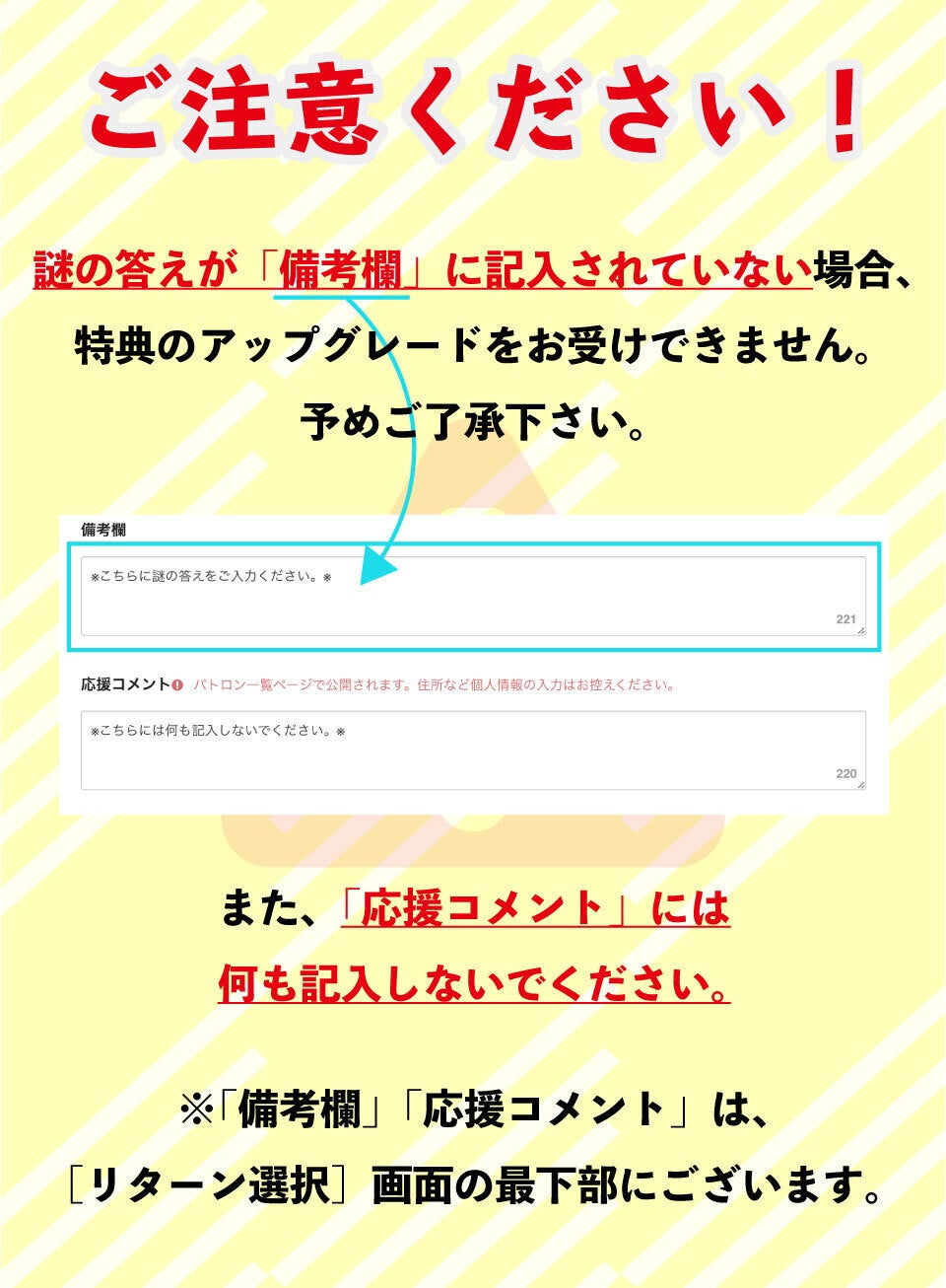 謎が解けたら「備考欄」に解いた答えを入力しよう!正解なら特典がグレードアップ!