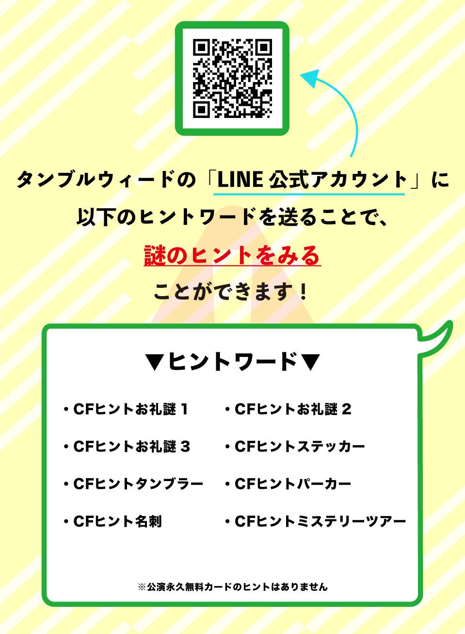 2020/01/25 21:00【ヒントワード公開!】タンブルウィード公式LINE@にヒントワードを送ることで、ヒントの閲覧が可能になりました!ヒントワードは画像をご覧下さい。 もっと見る