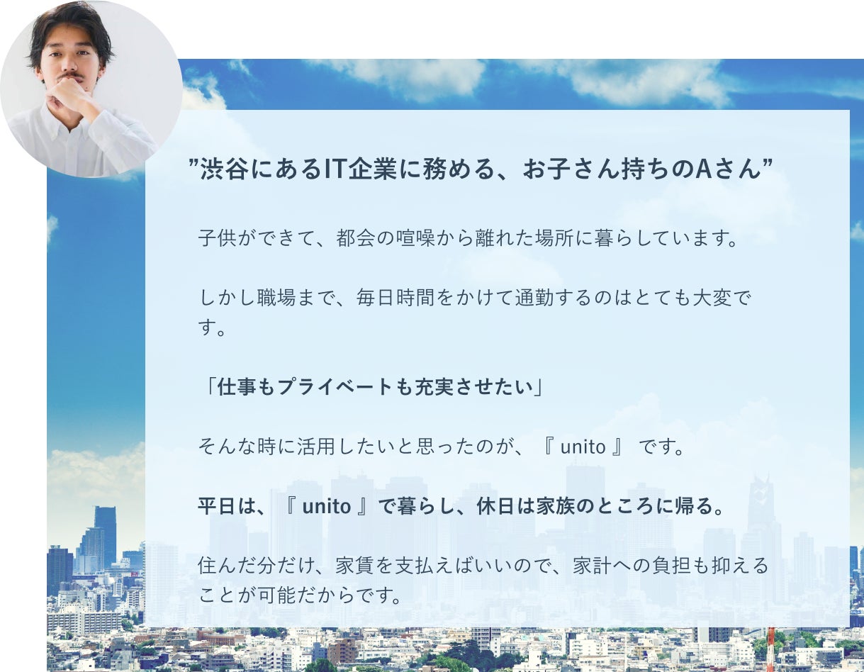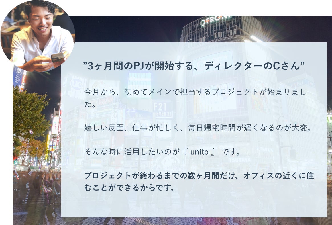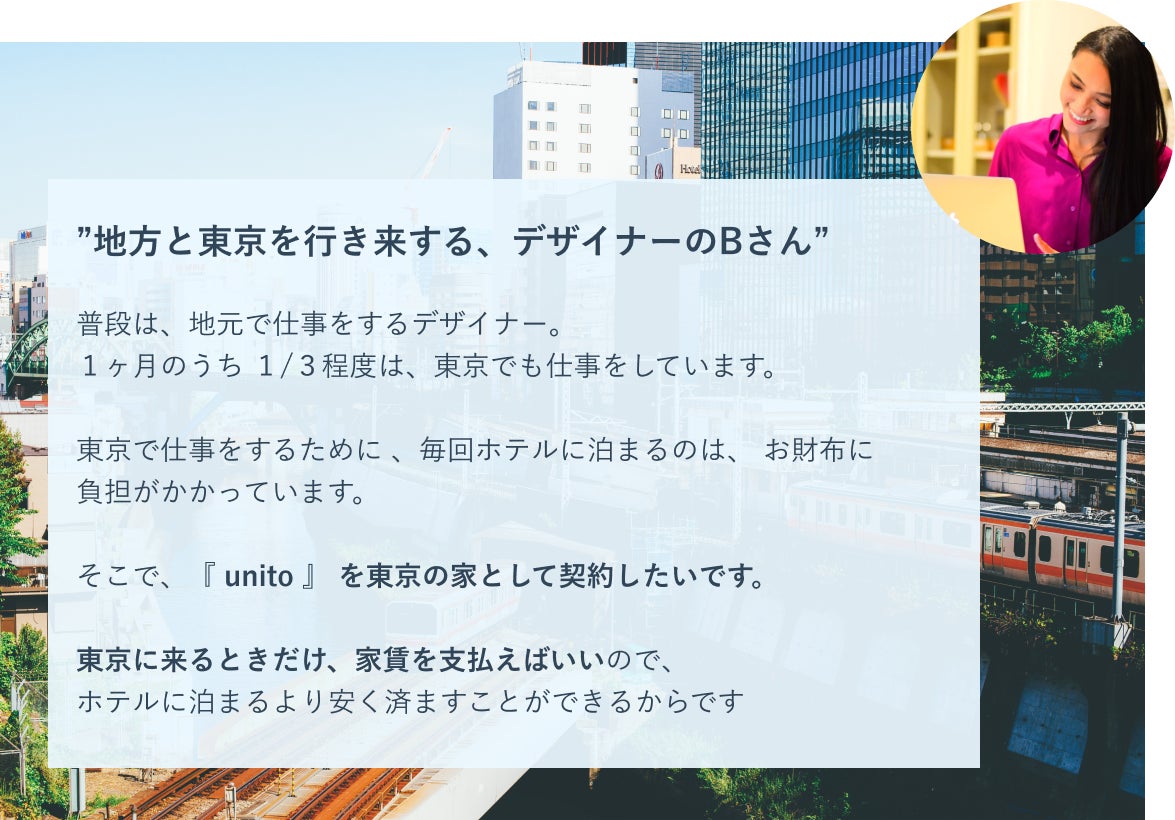 『 unito 』は、「ホテルに泊まる」と「家に住む」を融合させた日本初の暮らしのサービスです。
