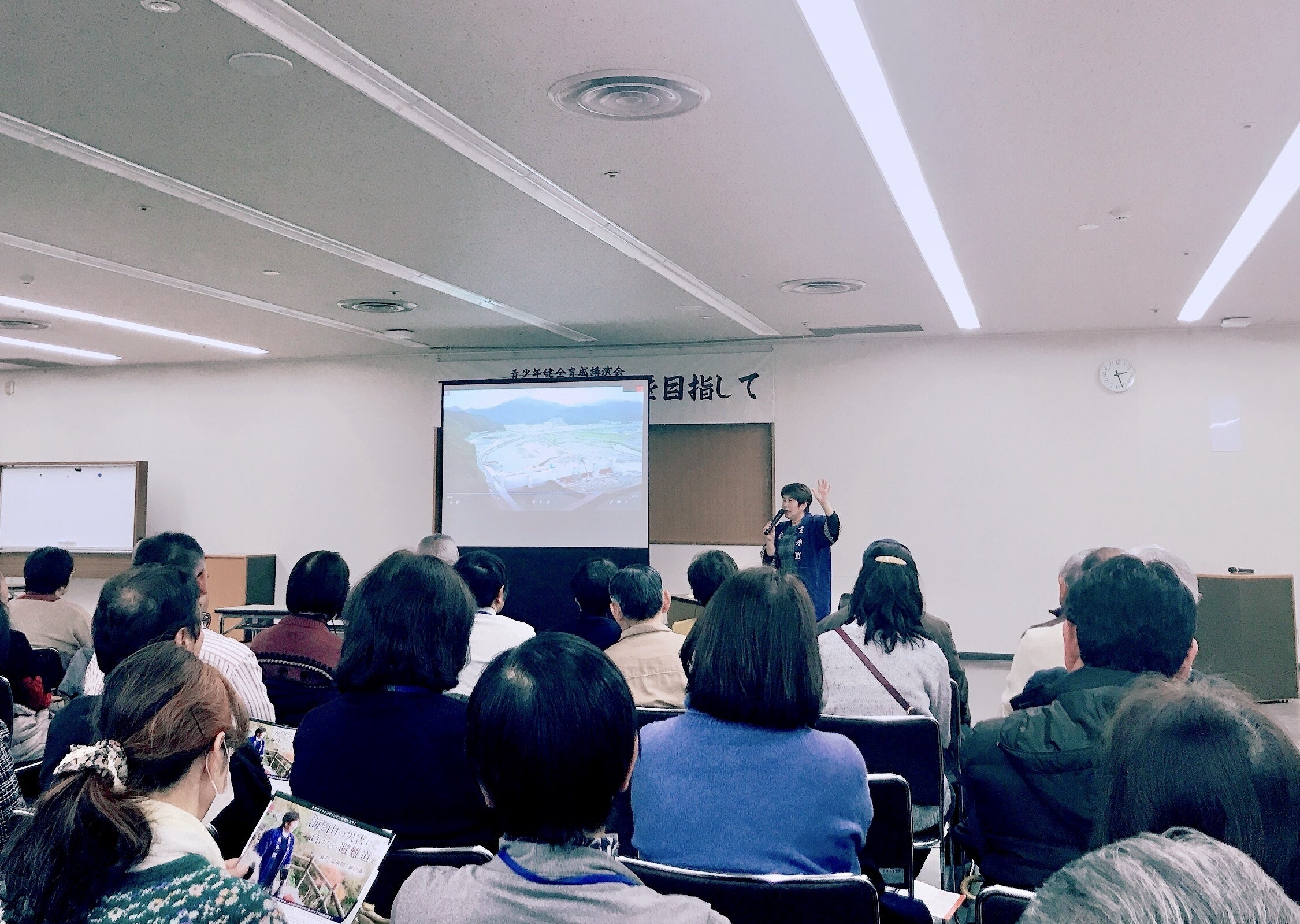 当日は100名近い方にご来場いただき、「地域の防災力」、「日頃からの備え」、鵜住居地域で子供達に行われていた「防災学習」、「避難所運営」での女性の役割などについてお話しさせていただきました。