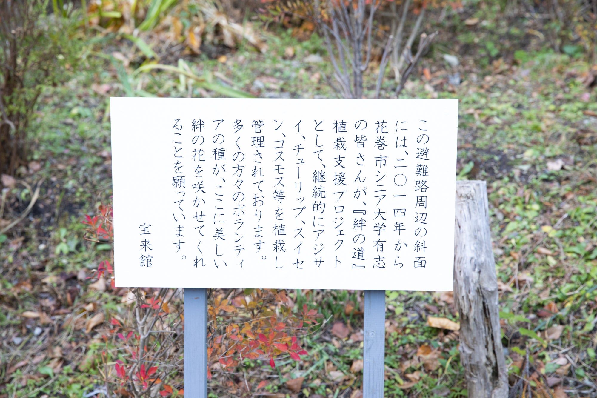 花巻市シニア大学の皆さんは、私たちが避難道をつくり始めたころ、「四季の花々で道作りを手伝いましょう」と提案して下さいました。いっしょに避難道づくりを進めていた釜石地方森林組合の高橋参事がこの話を聞き「この道はみんなの絆で繋がる道ですね」と言ったのがきっかけで、避難道を<絆の道>と命名しました。