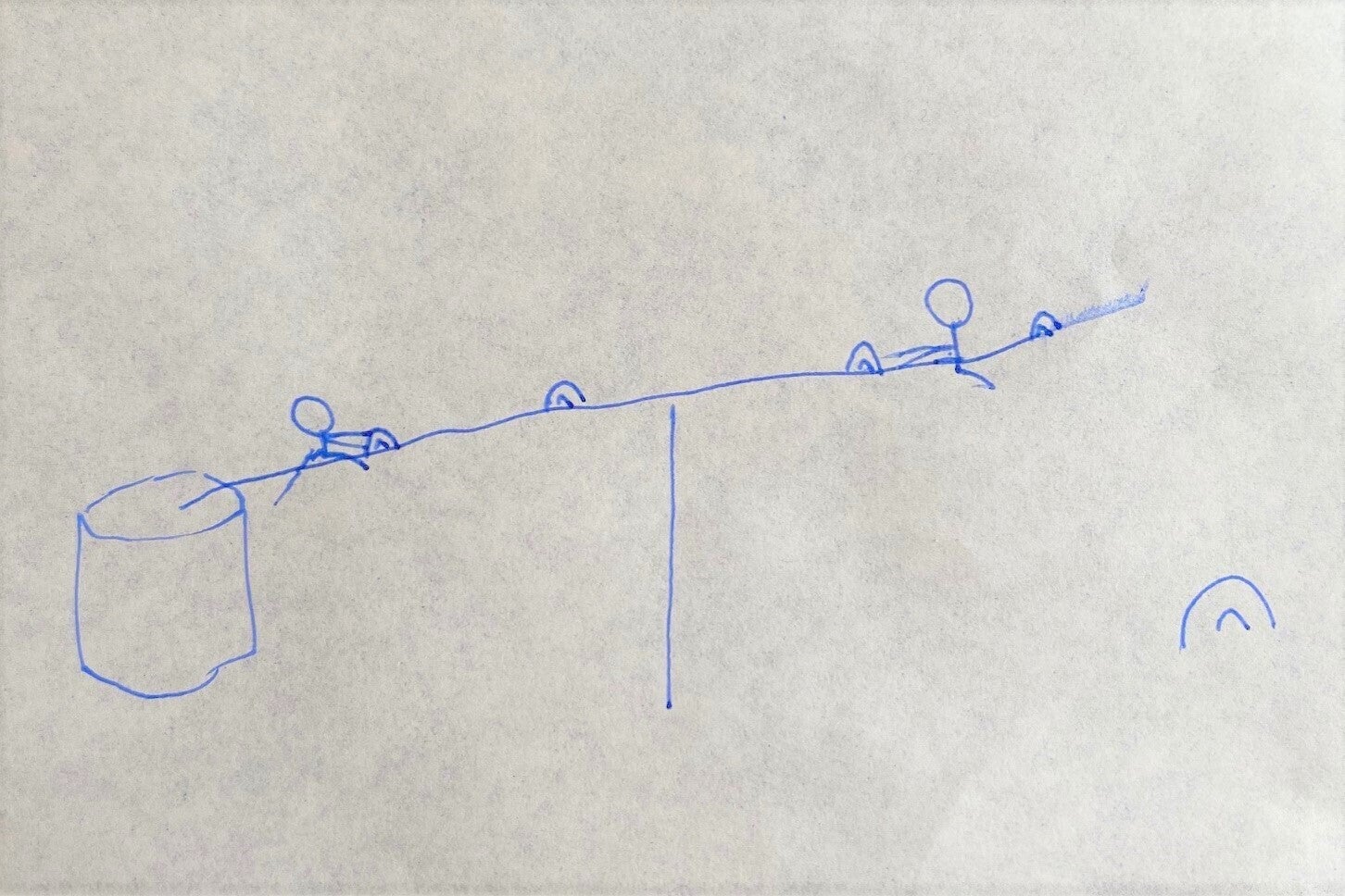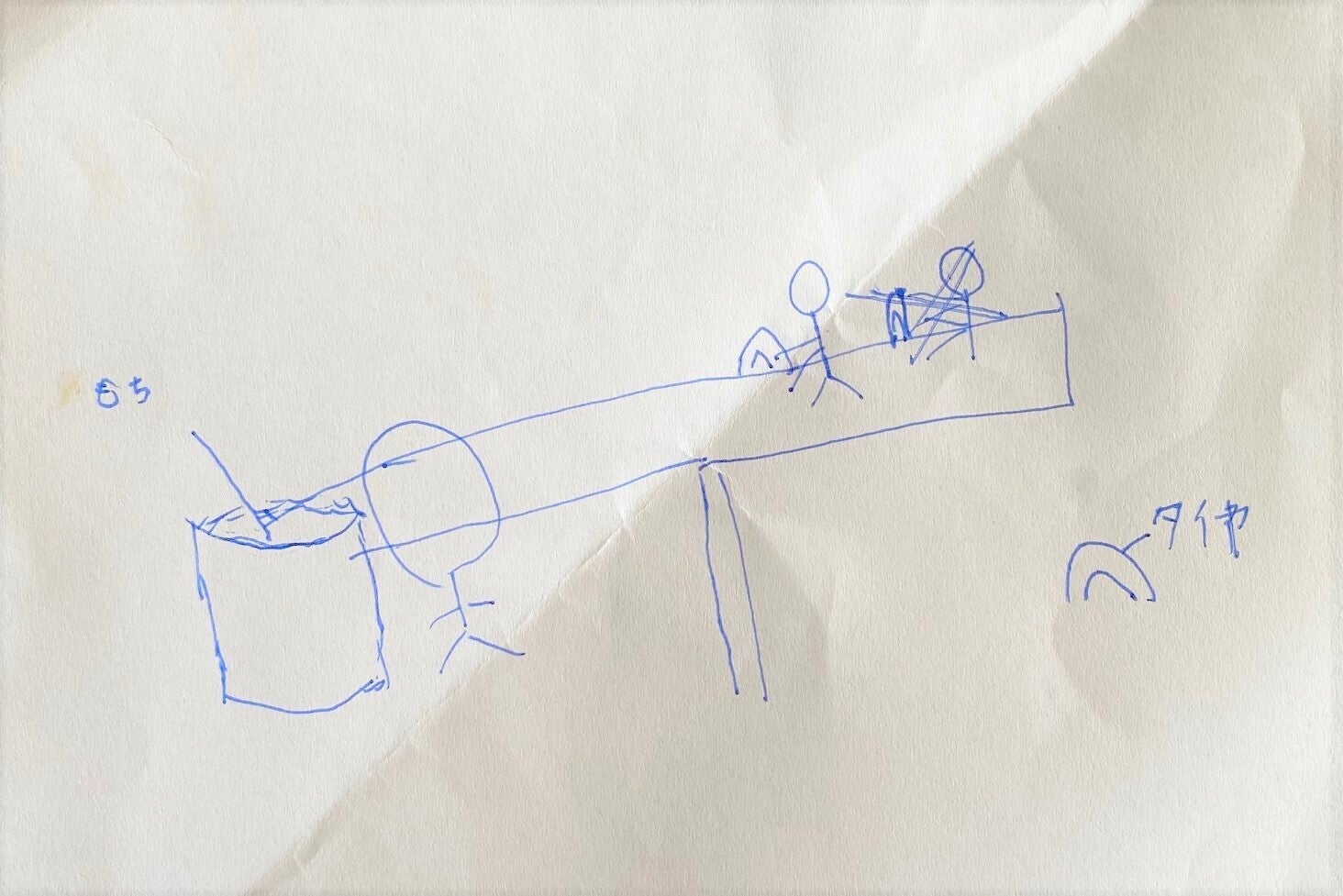 先週、マヒルが新たな発明を創作しました。その名は「餅つきぺったんシーソー」。以下がイメージ図だそうです。