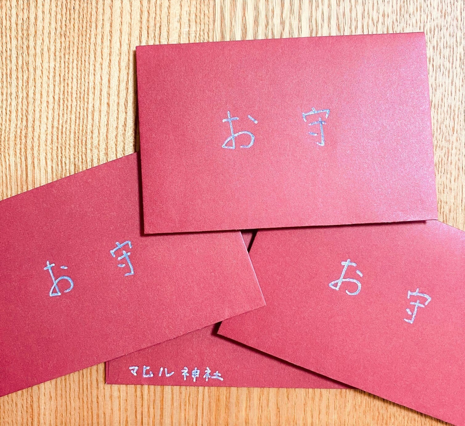今日、5千円、1万円コースの限定リターン品の準備がととのいました。マヒル神社のお守(写真)とミサンガです。