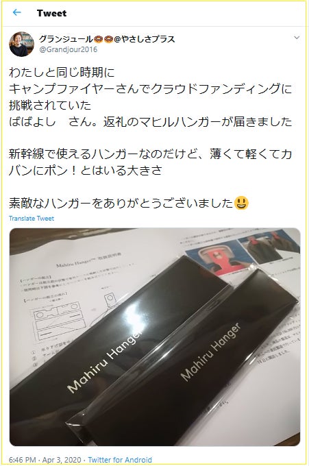 その後、マヒルハンガーが届いたことをSNSなどに投稿してくれた支援者の方もおり、とても嬉しく思います。
