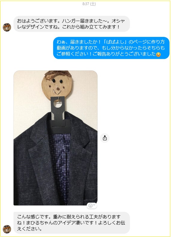 以前にマヒル父が職場でお世話になった里川さん。早速、スーツ掛けとして使ってくれたようです。「重みに耐えられる工夫がある」とのお褒めの言葉をもらっちゃいました!