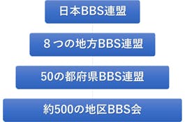 全国に約500の地区BBS会、50の都府県BBS連盟、8の地方BBS連盟から構成され、約4,500名程度の会員からなる組織です。